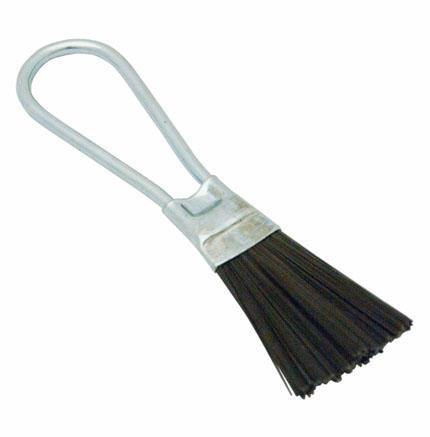 La Wire Loop Brush est une brosse en éventail de 1,5 cm de large avec des poils métalliques de 1,5 cm de long et une poignée en fil de fer. La brosse de 4-3/4in de long est conçue pour être utilisée sur des toiles métalliques grossières.