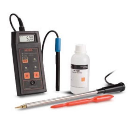 La mesure directe du sol est facilitée par la sonde HI 76305 de petit diamètre, en acier inoxydable et pointue.