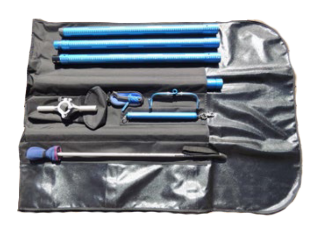 Les accessoires standard comprennent une clé d'entraînement, un roteur de filets, des clés, une perche de nettoyage et une mallette de transport en nylon.