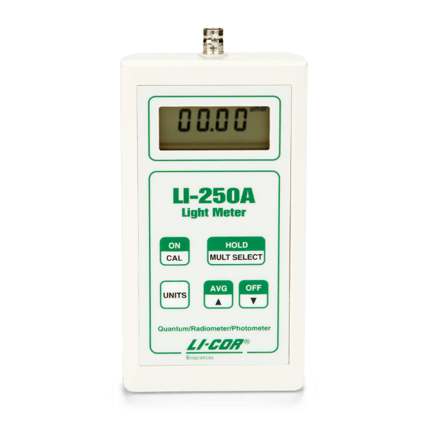 Le LI-250A est un compteur portable qui affiche la sortie de n'importe quel capteur de lumière LI-COR dont le câble se termine par un connecteur BNC. Il affiche les valeurs instantanées ou les moyennes sur 15 secondes des valeurs d'un capteur.