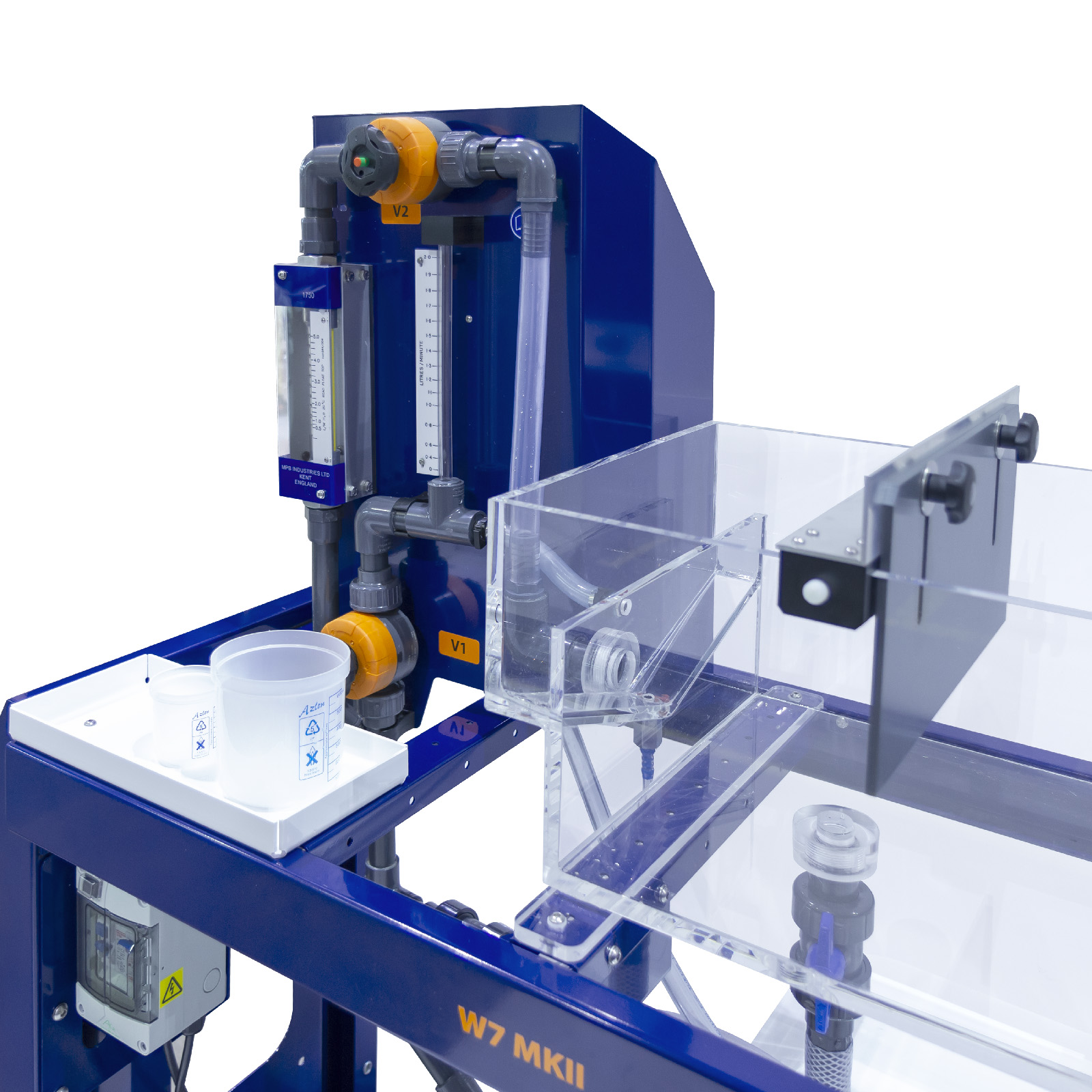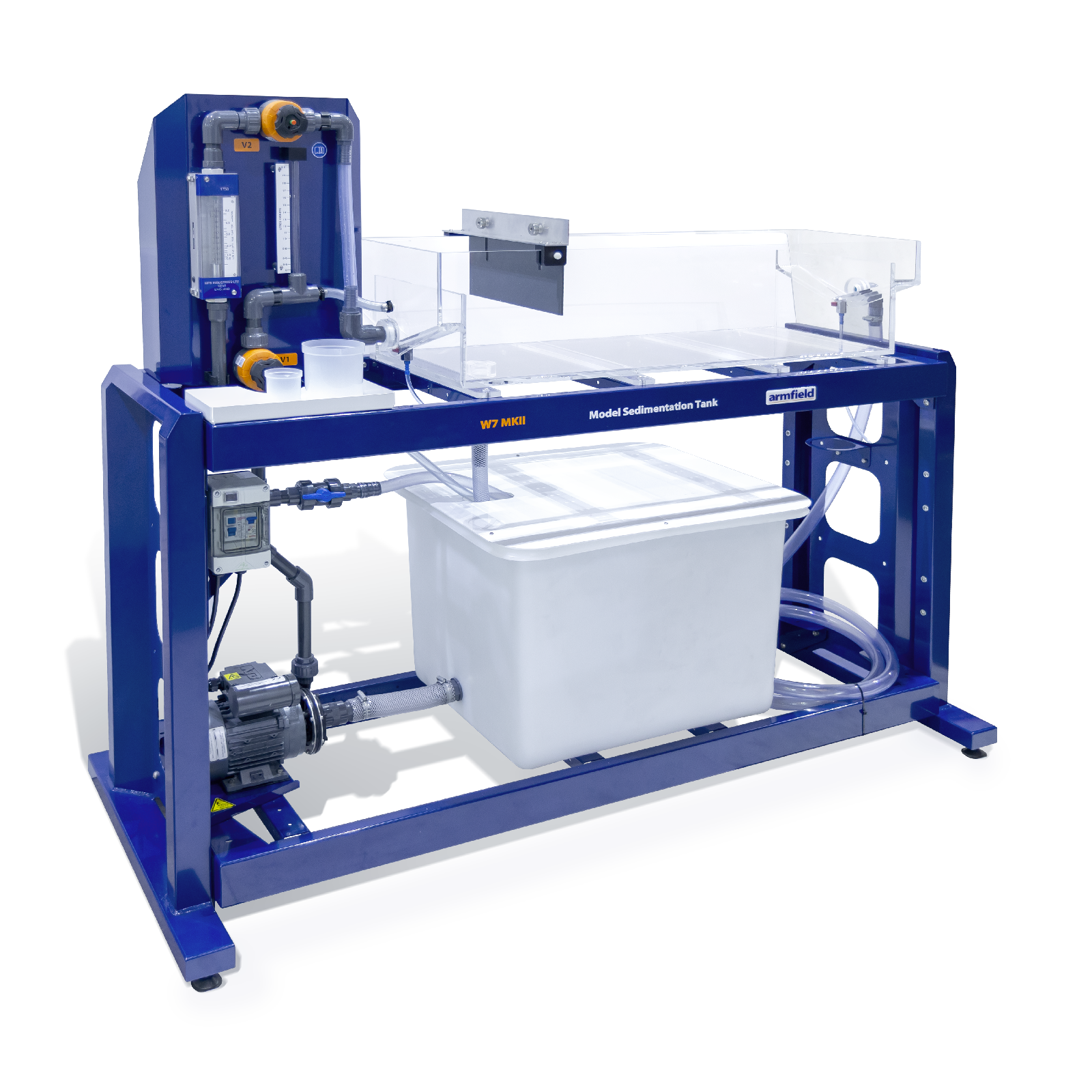Cette unité a été conçue pour démontrer les caractéristiques hydrauliques et l'efficacité de décantation d'un modèle de bassin de décantation. Bien qu'il soit difficile de reproduire les bassins de sédimentation de taille industrielle, des déductions pertinentes peuvent être faites sur la façon dont les flux non uniformes se produisent et comment ils interagissent avec les caractéristiques de décantation de suspensions particulières.