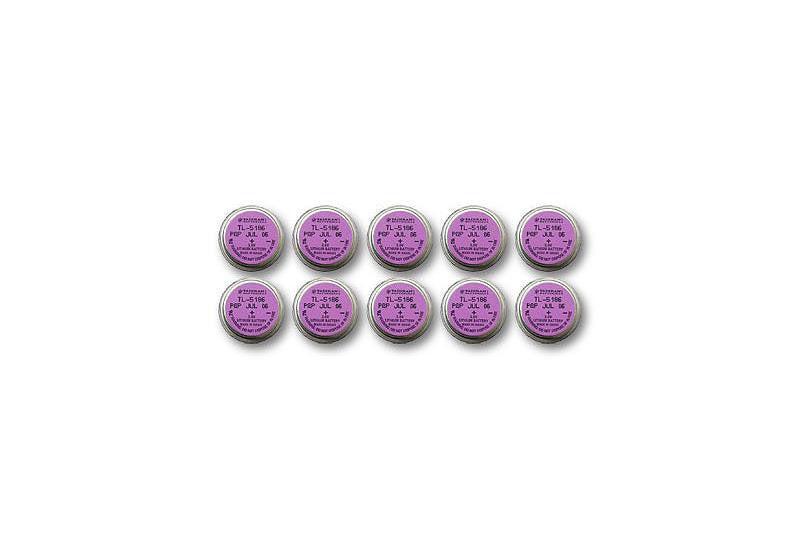 Un sachet de dix piles à étiquette violette protégées par de la cellophane pour les anciens enregistreurs de données HOBO et StowAway.