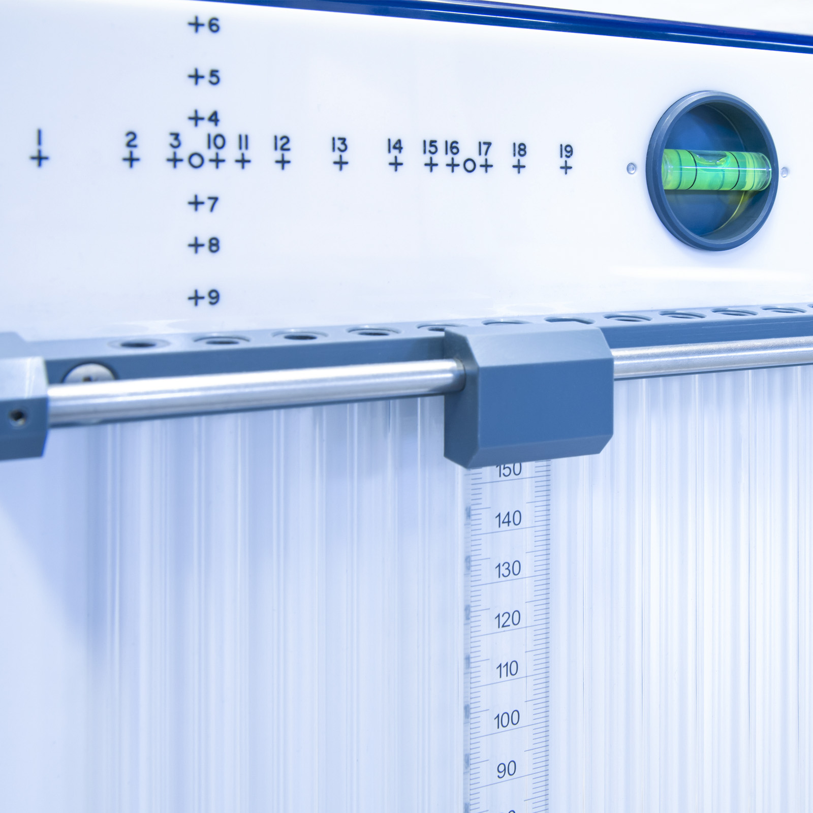 Calibré : Intervalles de 1 mm Le gradient hydraulique (loi de Darcy) résultant de l'écoulement des eaux souterraines entre deux potentiels peut être démontré visuellement. Les niveaux dans les tubes piézométriques sont tracés pour montrer un profil linéaire (fig.1 ci-contre). L'eau qui s'écoule dans un puits crée une dépression dans la nappe phréatique. Le contour de la nappe phréatique est tracé à l'aide des niveaux des tubes piézométriques.