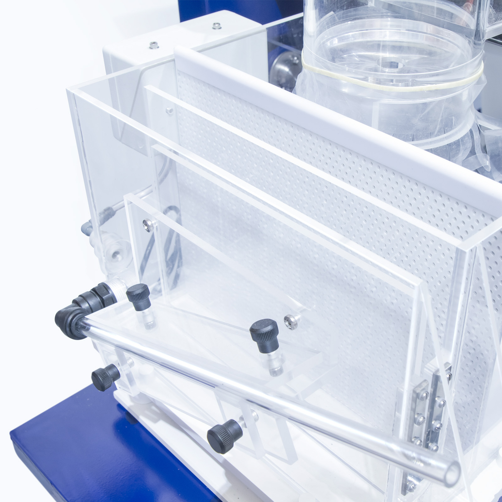 La mesure du débit est effectuée en mesurant la hauteur de l'eau s'écoulant par le déversoir de sortie, à l'aide d'un manomètre incliné à lecture directe.