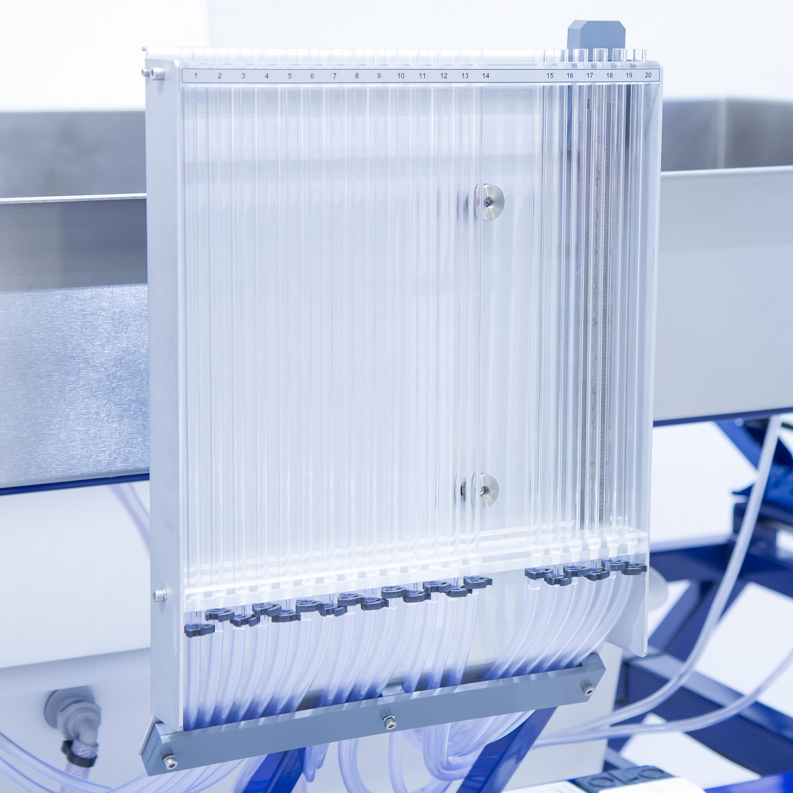 Les niveaux de la nappe phréatique (surface phréatique) sont mesurés à l'aide de 20 points de prélèvement dans le réservoir de sable, configurés selon un schéma cruciforme, et affichés sur une banque de manomètres.
