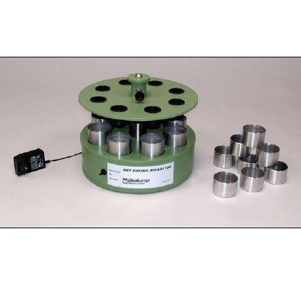 L'appareil de tamisage humide est utilisé pour déterminer la stabilité des agrégats susmentionnée. La stabilité des agrégats humides est déterminée selon le principe que les agrégats instables se décomposent plus facilement que les agrégats stables lorsqu'ils sont immergés dans l'eau. Pour déterminer la stabilité, 8 tamis sont remplis d'une certaine quantité d'agrégats de sol. Ces tamis sont placés dans un récipient rempli d'eau, qui se déplace de haut en bas pendant une durée déterminée. Les agrégats instables se désagrègent, passent à travers le tamis et sont recueillis dans le récipient rempli d'eau situé sous le tamis. La procédure d'essai permet d'obtenir un indice de stabilité des agrégats.