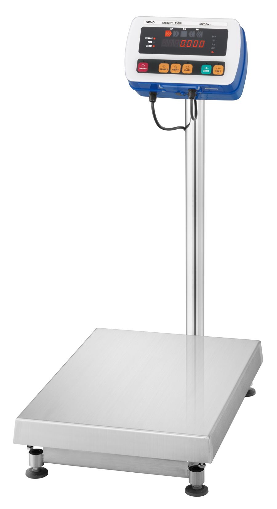 SW Super Washdown Bench Scales are designed to withstand the most demanding process conditions and high pressure, high temperature cleaning. With a superior IP69K rating (1450 PSI, 175°F), stainless steel frame, load cell and weigh pan, SW bench scales are ideal for food processing applications and extremely damp locations where cleanliness and sanitation are critical. Weighing modes include parts counting and comparator function for checkweighing applications. Weighs in lb, kg, oz, g, lb-oz with easily switchable units.