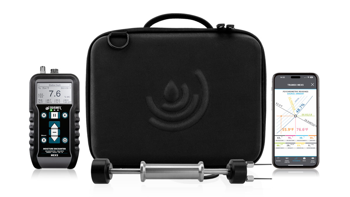 It also features a built-in hygrometer for ambient conditions and psychrometric values, an Infrared Surface Thermometer and connects to the hand-held hammer-action pin probe for wood, drywall, and WME readings.