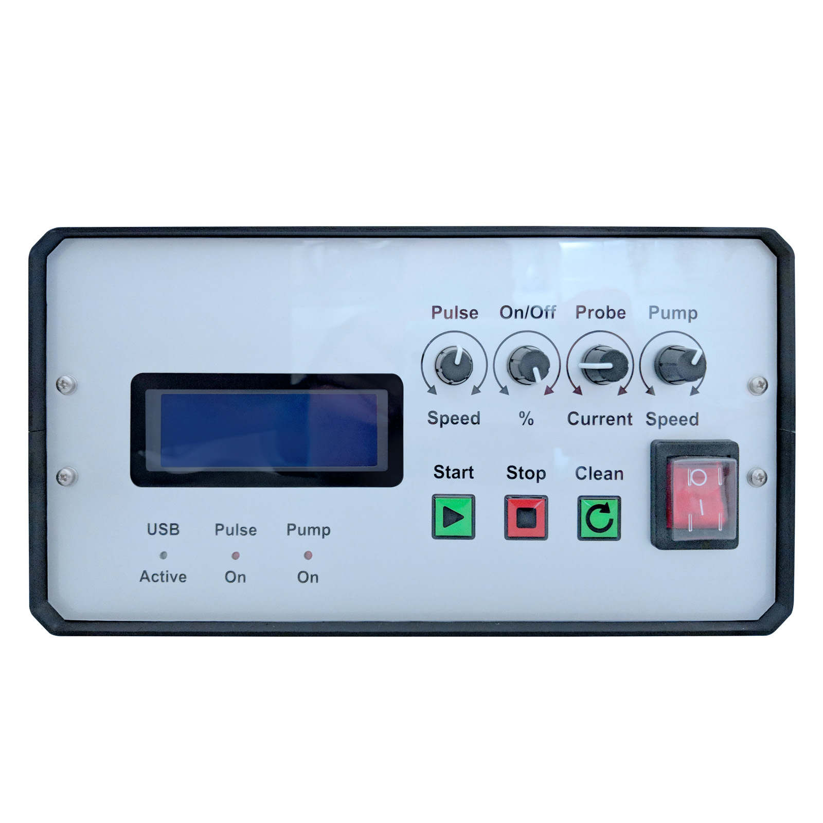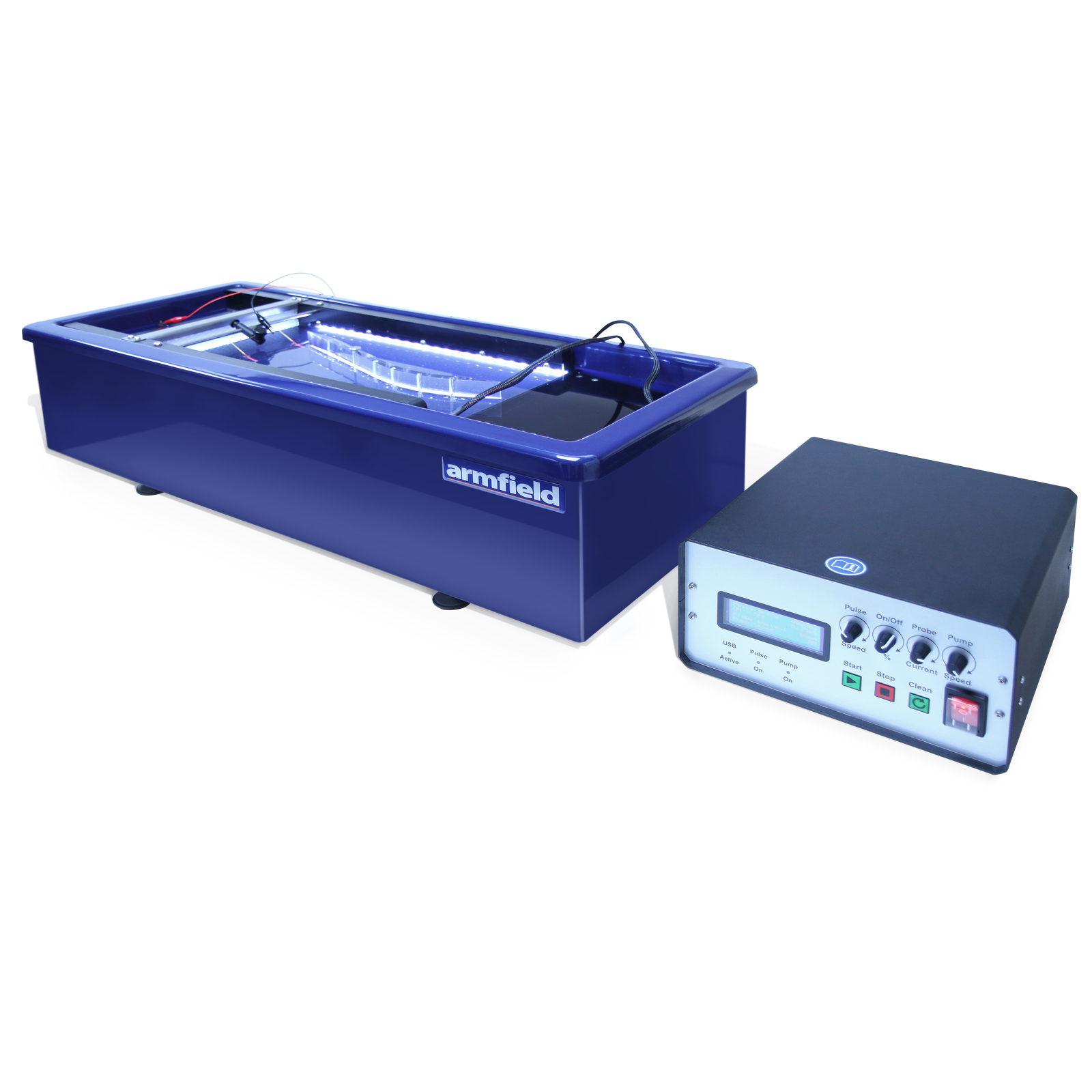 The electronic control console provides all of the necessary electrical services for the flow tank and incorporates the hydrogen bubble generator. All operating parameters are displayed on a liquid crystal display. Controls are included for the water pump, light source and hydrogen bubble generator.