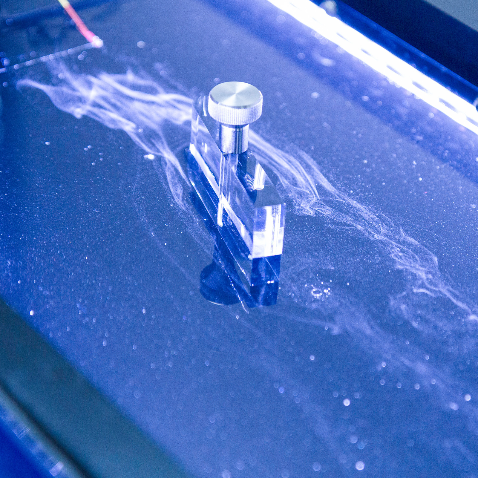 A lighting module, placed in the water at the side of the working section, produces a wide beam of light below the surface of the water and illuminates the hydrogen bubbles to aid visualisation of the flow patterns.