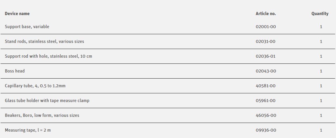 The students should measure the height that water rises in four capillary tubes and investigate the resulting graph. In a supplementary problem the graph generated by plotting the measured values against the reciprocals of the diameters should be analysed.
