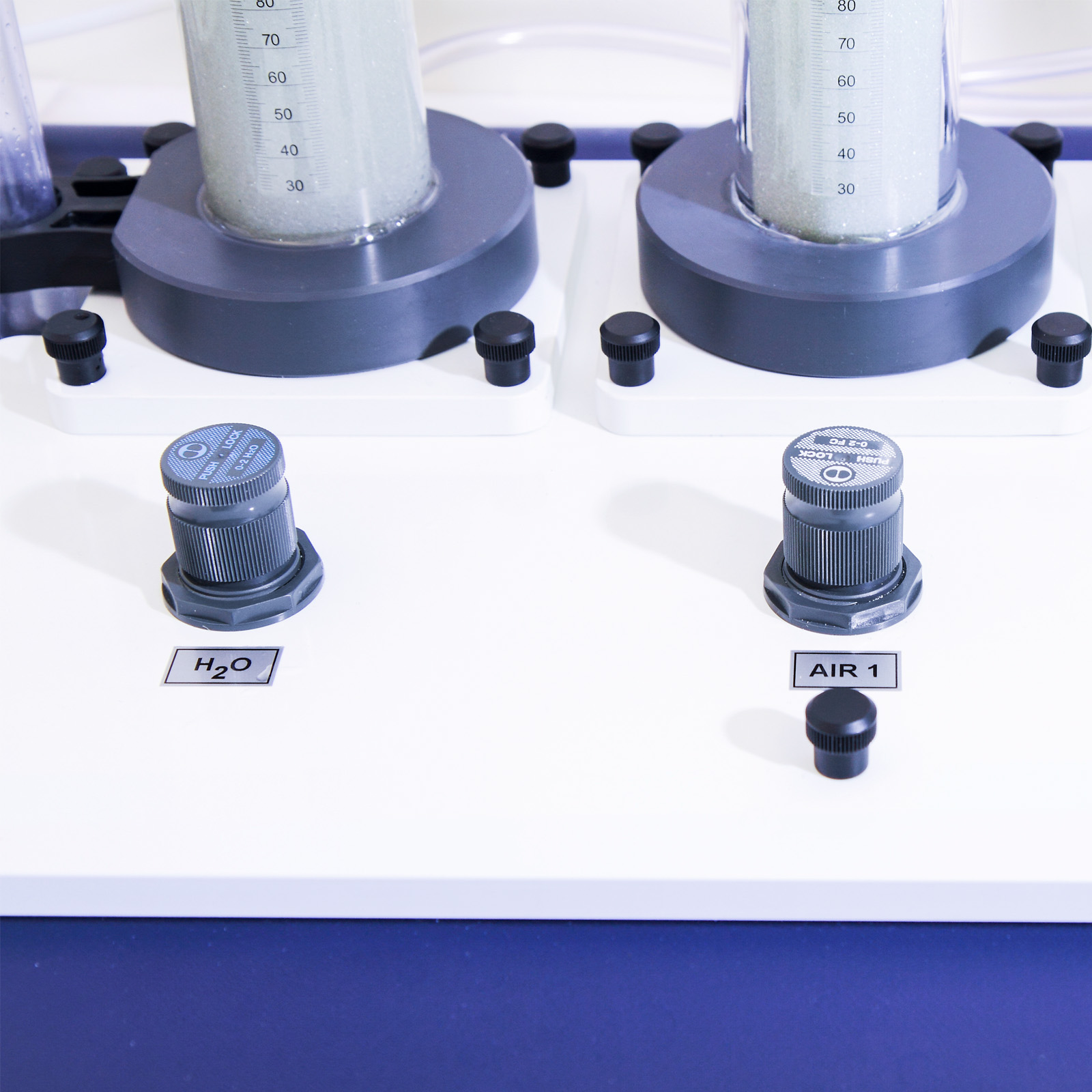 The two air columns are fed by variable pressure regulators, which can be used to adjust the air flow rate through the column. The air flow rate is measured using pressure sensors at discharge orifices at the top of the columns. The integral microcontroller calculates the flow rates from the pressure readings and displays these on the front panel.