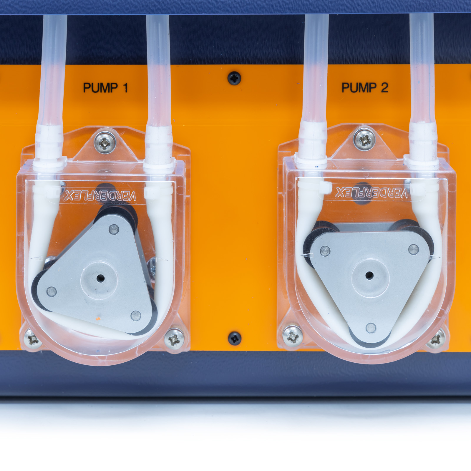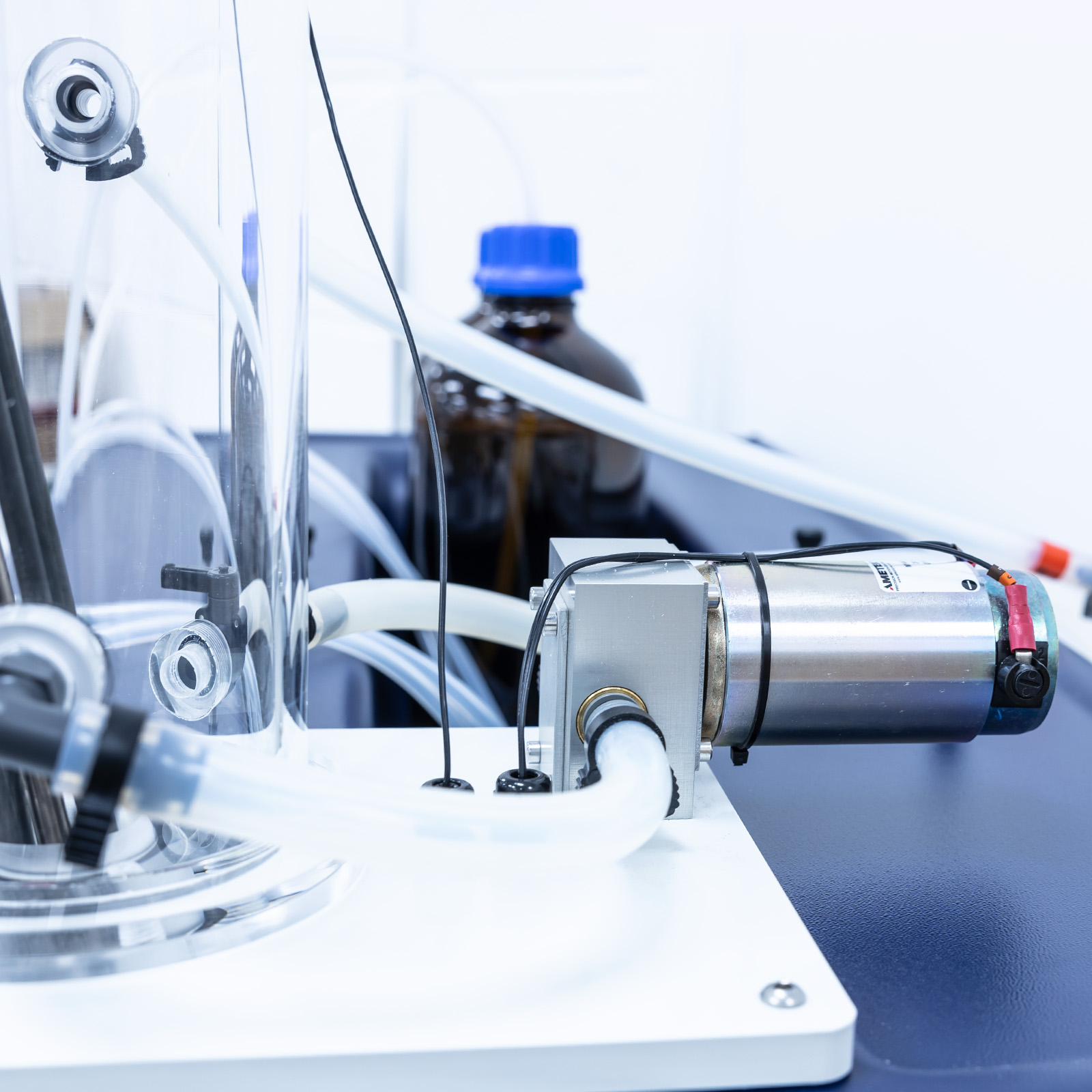 The CEXC provides a locating position for two standard 2.5 litre chemical storage bottles for the reagents within the plinth. This provides safety in use. The bottles can be quickly capped and removed as necessary for safe handling. Two 2.5 litre bottles are also provided with the equipment. Alternatively, for longer experiments, larger feed vessels could be located either on the floor or on the bench next to the equipment.