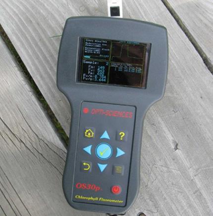 Fv/Fm has been shown to correlate with carbon assimilation for may types of plant stress. The OS30P+ measuring trace is graphically displayed in color, and Fo is accurately measured using red modulated light.