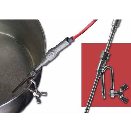 Designed for temperature measurement of liquids inside open containers such as pots or vats. The sensor is secured by a clamp that is fastened onto the container’s rim and allows adjustable insertion depth. Available in all thermocouple types, RTDs and thermistors.