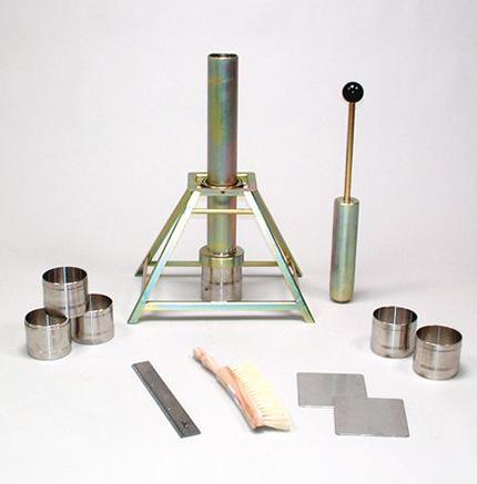 The standard set includes (according to RAW-2000, test 4.4): a stainless steel sample ring with cutting edge for non-cohesive material and one for clay and clayey light gravely sand, a collar for the sample ring, a guide cylinder for the drop weight, a drop weight, a frame for the guide cylinder a steel rule , a flat stainless steel plate, a flat brush and a water level.