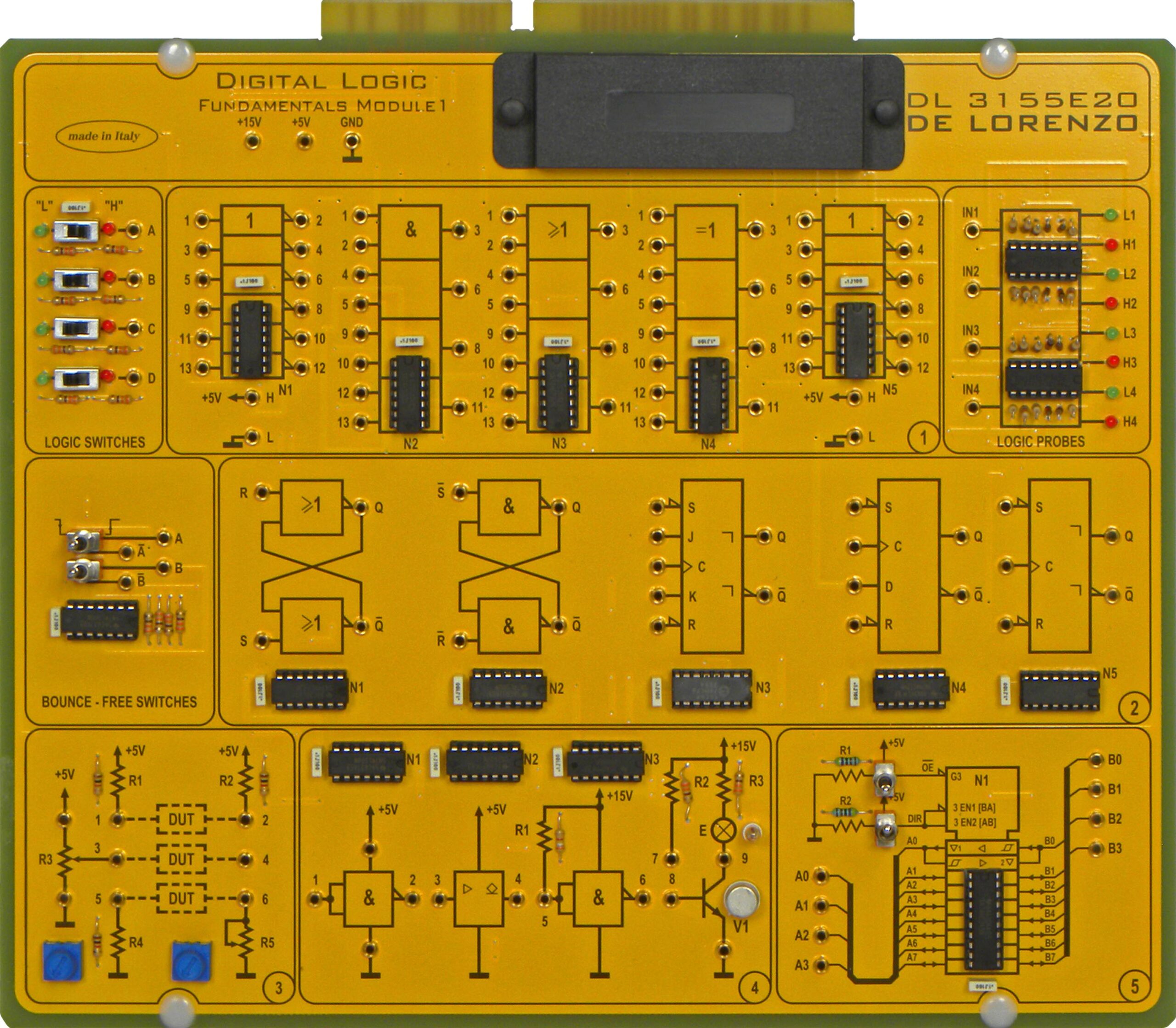 With this board the students can study the fundamentals of digital logic, the theorems of Boolean algebra, the logic functions, the karnaugh’s maps, the logic gates NOT-AND-OR-NAND-NOR, the flip-flops and the logic families TTL and CMOS.