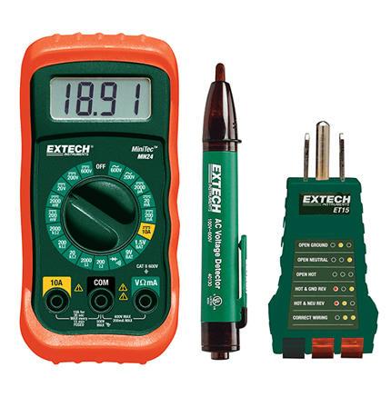 Basic troubleshooting tools for common electrical problems The Extech MN24-KIT is an Electrical Test Kit which provides you with basic troubleshooting tools for common electrical problems. This electrical test kit comes with three powerful tools; the MN24 Manual Ranging CAT II-600V MiniTec MultiMeter, the 40130 Non-Contact Voltage Detector and the ET15 Receptacle Tester. The MN24 […]