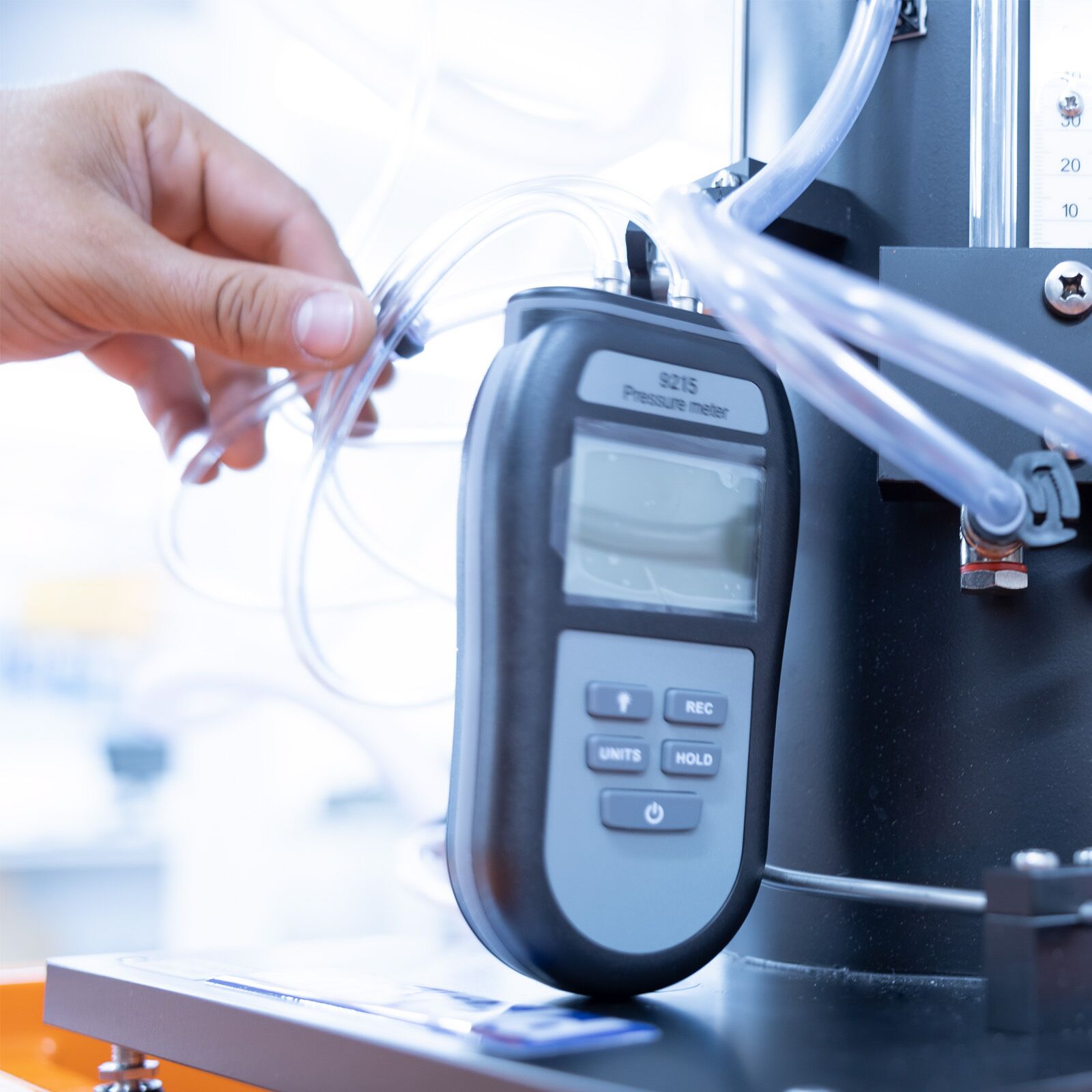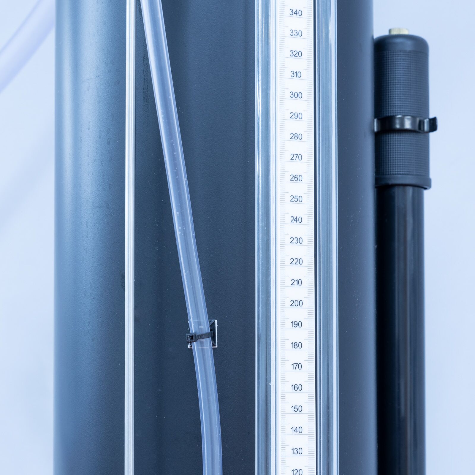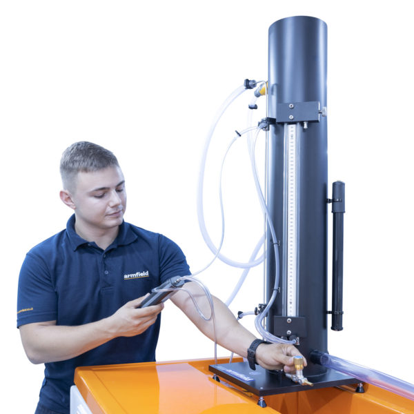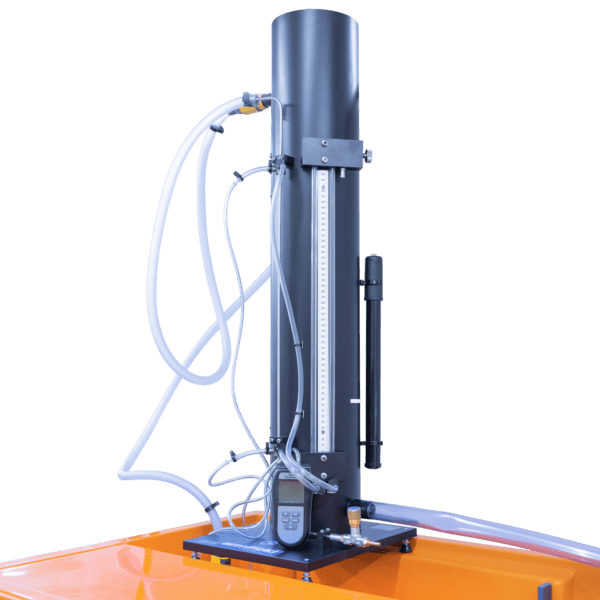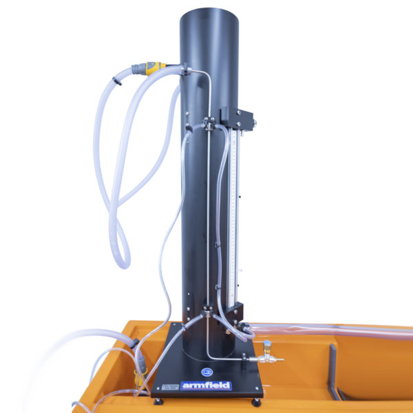 The unit consists of a vertical test pipe on the side of the equipment which can be fed directly from the hydraulics bench supply or, alternatively, from the integral constant head tank above. For large pressure differentials a digital handheld manometer is used.