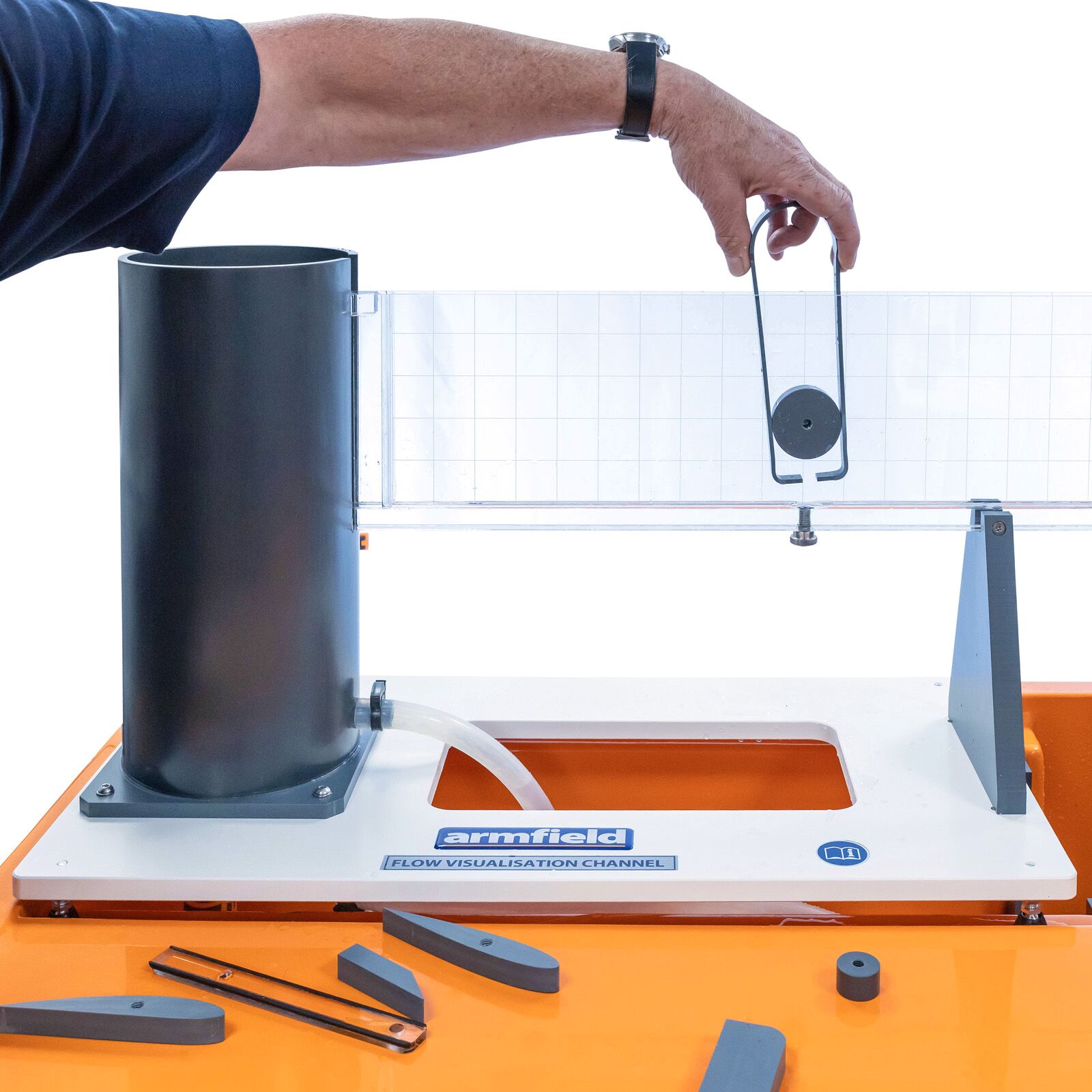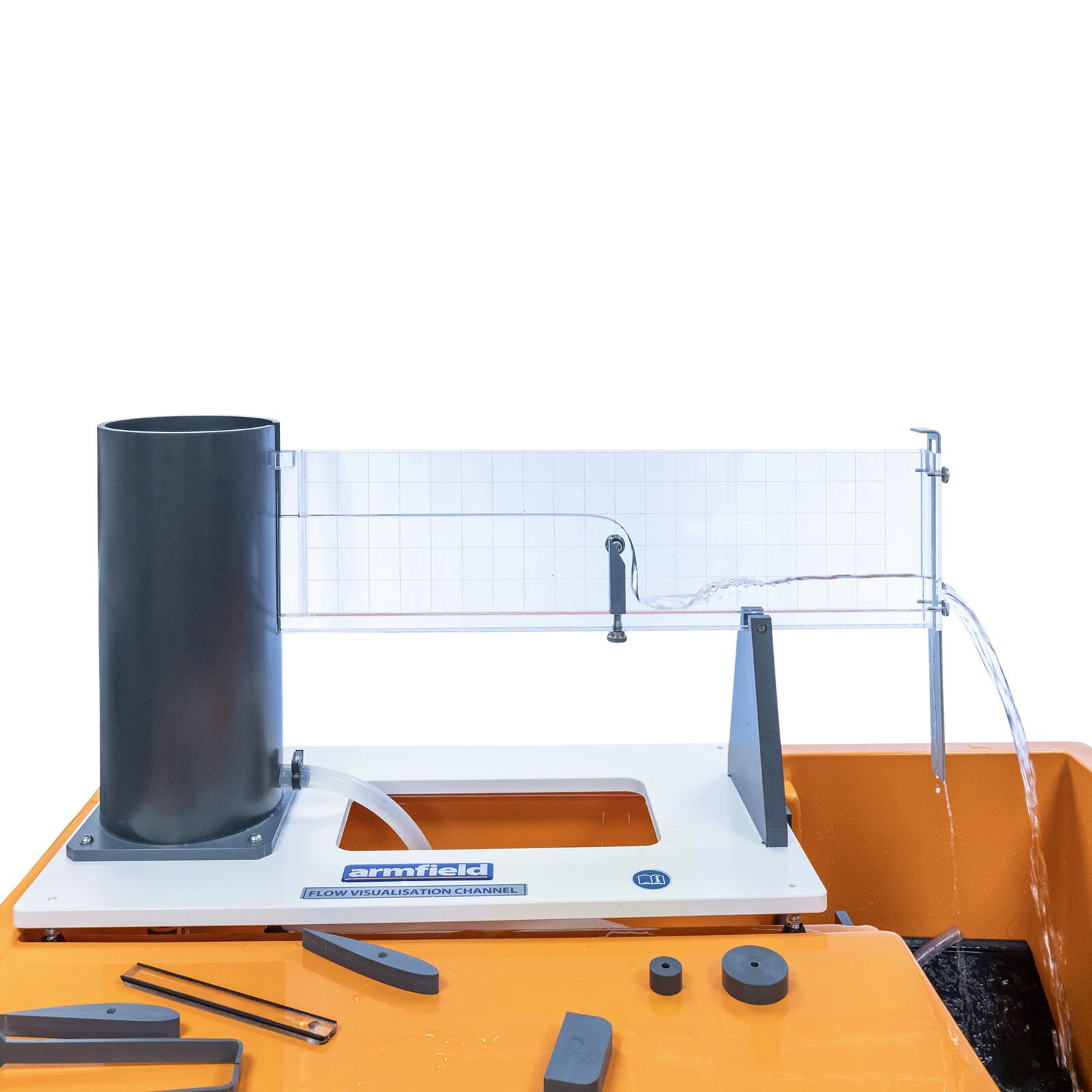 Models supplied with the channel include broad and sharp-crested weirs, large and small-diameter cylinders and symmetrical and asymmetrical aerofoils. These in conjunction with the inlet and discharge weirs, permit a varied range of open channel and flow visualisation demonstrations, Adjustable feet permit levelling.