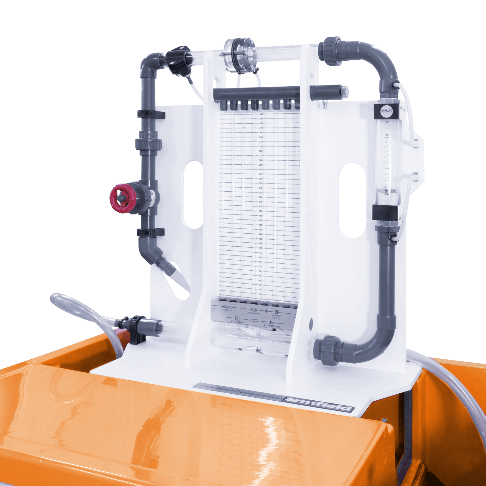 The equipment consists of a Venturi meter, variable area meter and orifice plate, installed in a series configuration to permit direct comparison. A flow control valve permits variation of the flow rate through the circuit. Pressure tappings are incorporated so that the head loss characteristics of each flow meter may be measured. These tappings are connected to an eight-tube manometer bank incorporating a manifold with an air bleed valve.