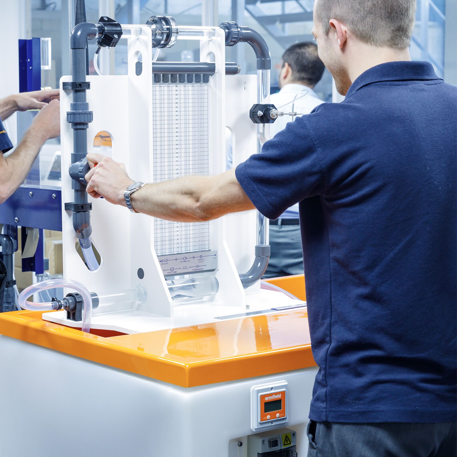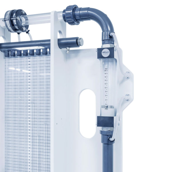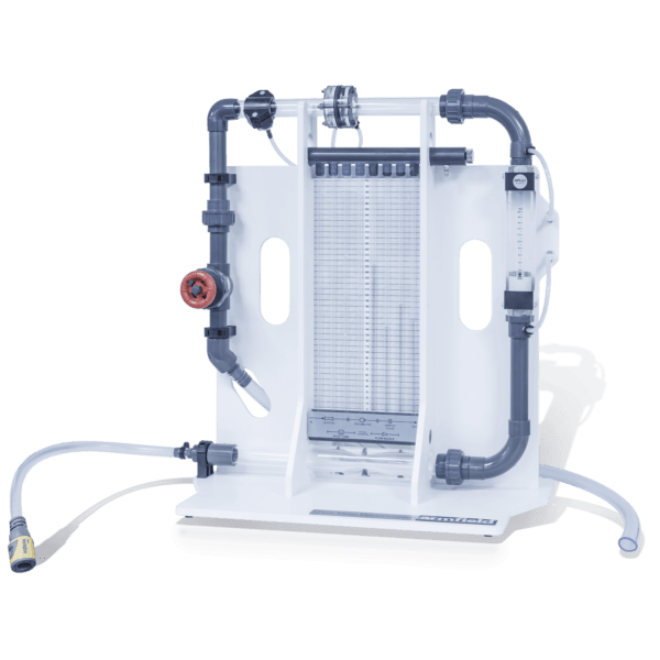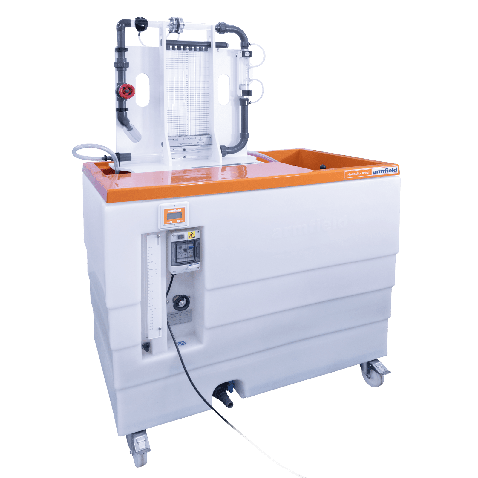 Pressurisation of the manometers is facilitated by a hand pump. The circuit and manometer are attached to a support framework, which stands on the working top of the Hydraulics Bench. The bench is used as the source of water supply and for volumetrically calibrating each flow meter.