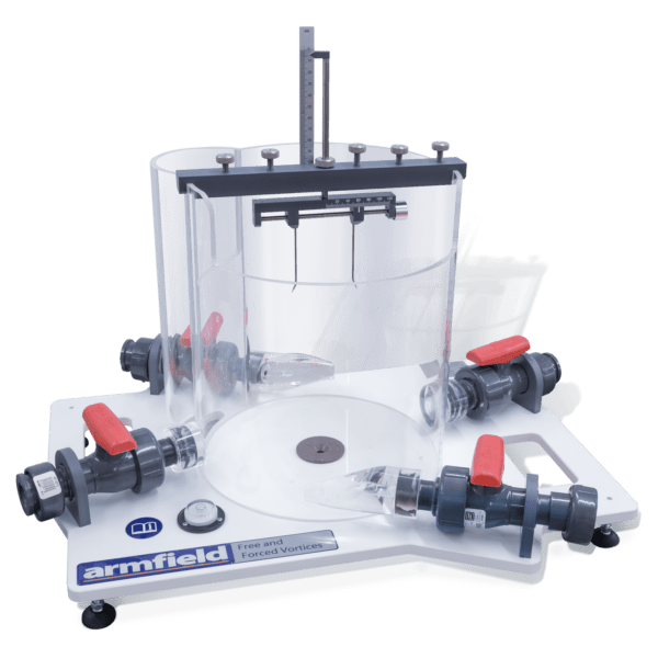 The free vortex is generated by water discharging through an interchangeable orifice in the base of the cylinder, and the resulting profile is measured using a combined calliper and depth scale. The forced vortex is induced by a paddle in the base of the cylinder, which is rotated by jets of water. The profile of the forced vortex is determined using a series of depth gauges.