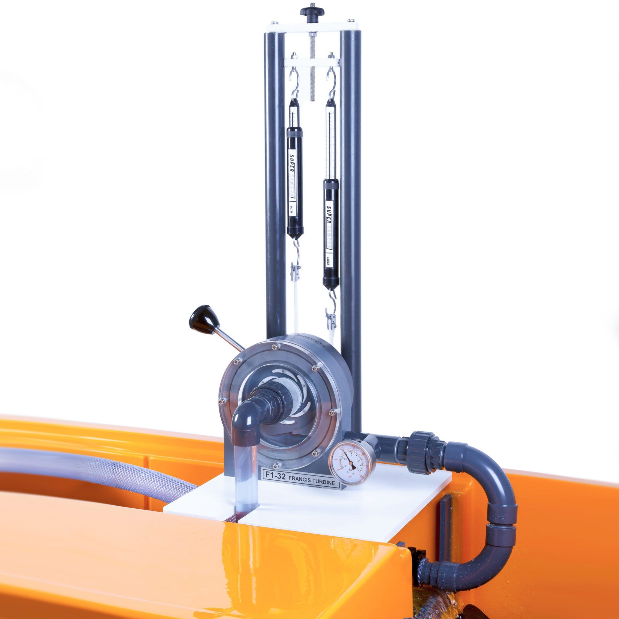 This demonstration turbine provides a simple low-cost introduction to the Francis inward flow reaction turbine showing its construction, operation and performance. The volute of the Francis Turbine incorporates a transparent front cover for clear visualisation of the runner and guide vanes and is designed to complement the F1-25 Pelton turbine.