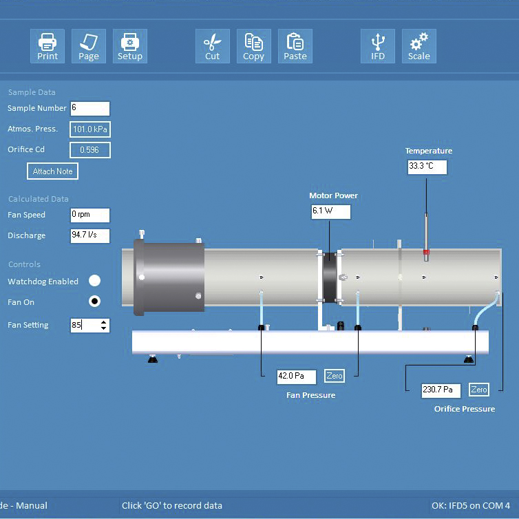 A calibrated orifice plate is used on the discharge to measure the air flow rate. Electronic sensors measure the pressure head developed across the fan, the pressure across the orifice plate (and thus the flow rate), the rotational speed of the fan and the air temperature.