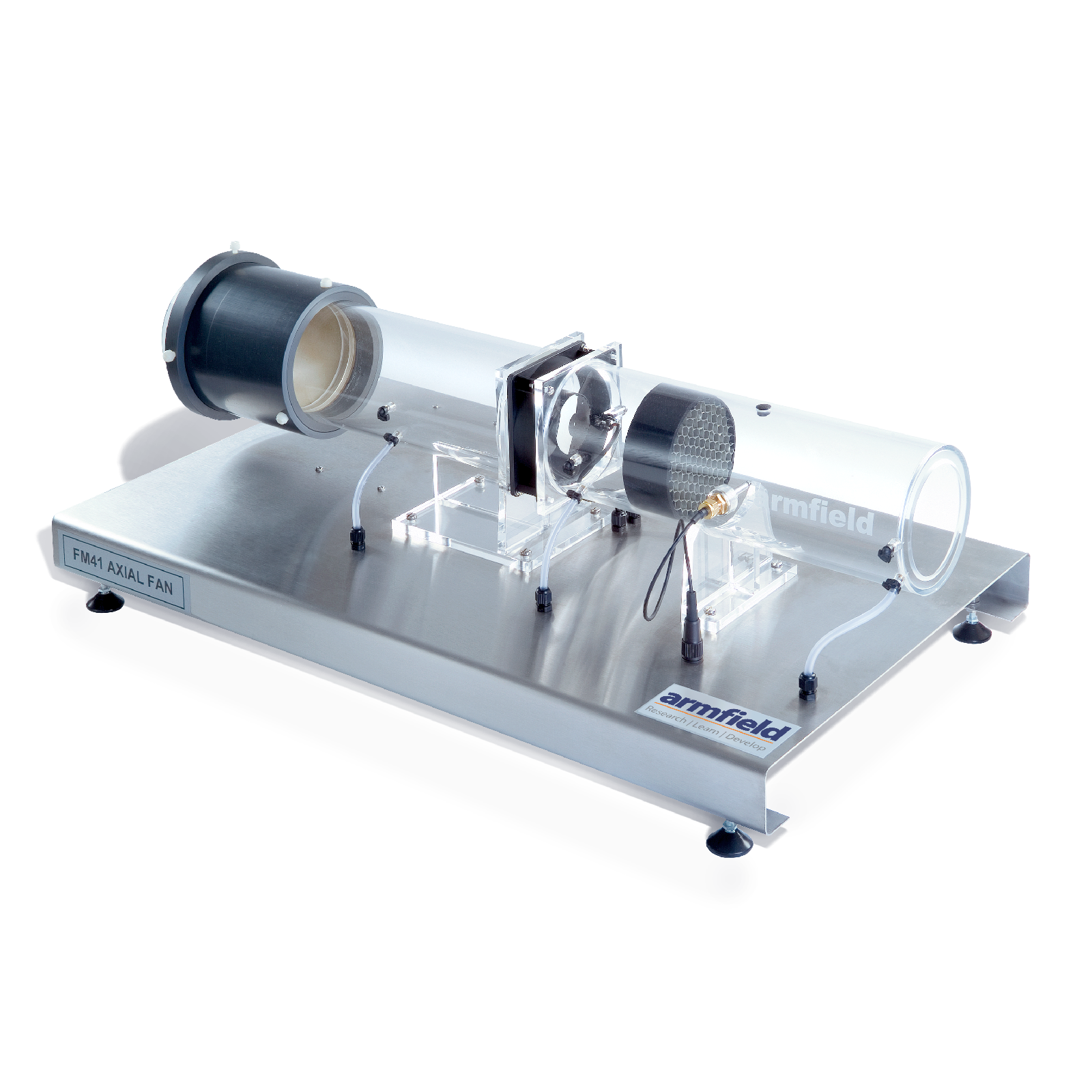 The Armfield Axial Fan Demonstration Unit is fitted with electronic sensors to measure the pressure head developed across the fan, the pressure across the orifice plate (and hence the flow rate), the rotational speed of the fan and the air temperature. The fan speed is controlled by modulated dc supply complete with current sensing to enable the power drawn by the fan to be measured.