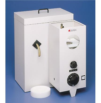 Front View Distillation Apparatus, Groups 0, 1, 2 and 3–Meets all ASTM and related specifications for distillation of motor and aviation gasolines, aviation turbine fuels, naphthas, kerosenes, distillate fuels, natural gasoline, liquid hydrocarbon mixtures and other petroleum products. Consists of fully insulated stainless steel condenser and heater units. Heater unit includes flask support platform, viewing window, 1000W heater with stepless variable control, and rack and pinion heater elevation mechanism with push-turn control knob. Please inquire about higher wattage heaters. White receiving flask background facilitates viewing of fractions during test. Available with right-hand or left-hand heater unit for convenient pairing. Includes graduate support block and flask support boards.