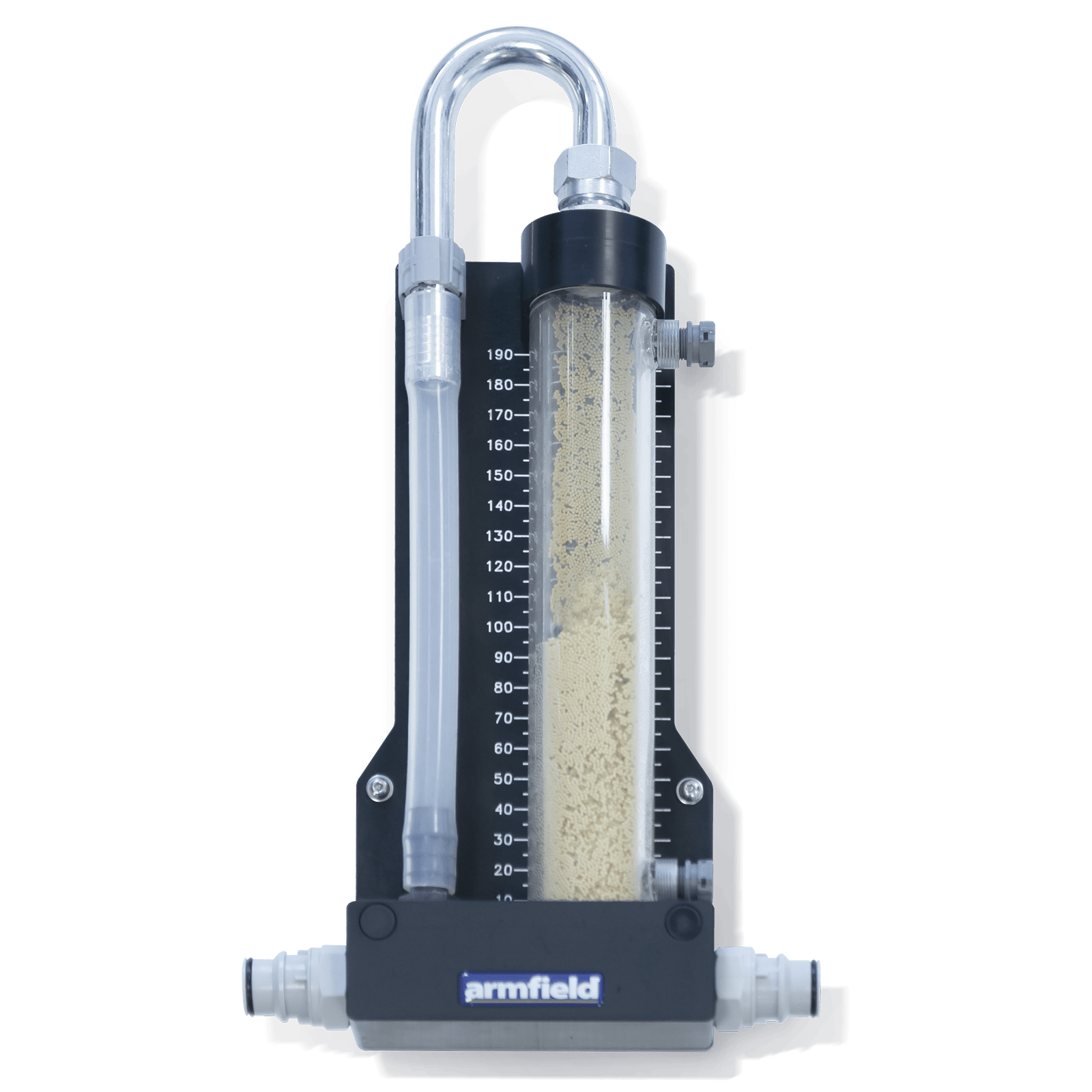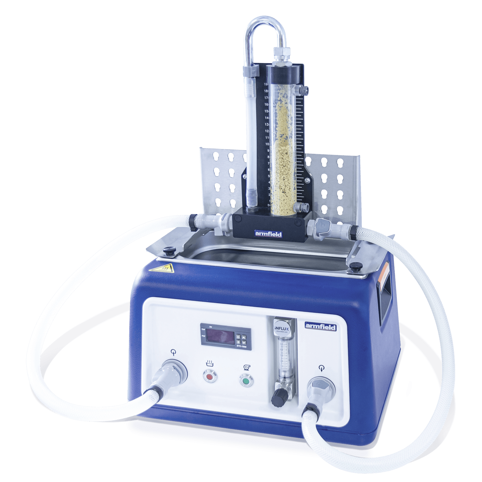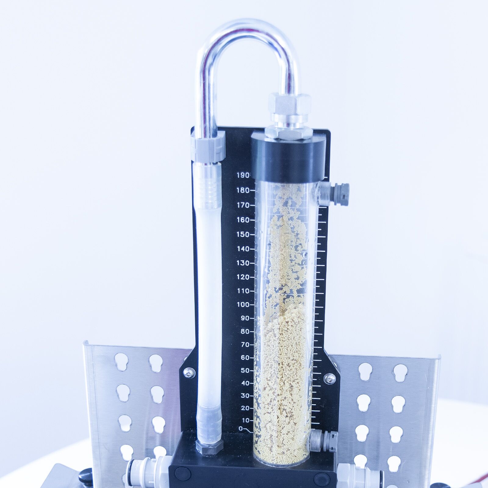 The experiment contains small-diameter glass beads in a clear glass cylinder. The drop in pressure between the inlet and outlet of the cylinder is measured as the water flows through the bed. Whilst visually allowing the students to observe the particle behaviour as the flow rate increases they can monitor the difference in pressure on flow rate to the point of fluidisation and beyond.