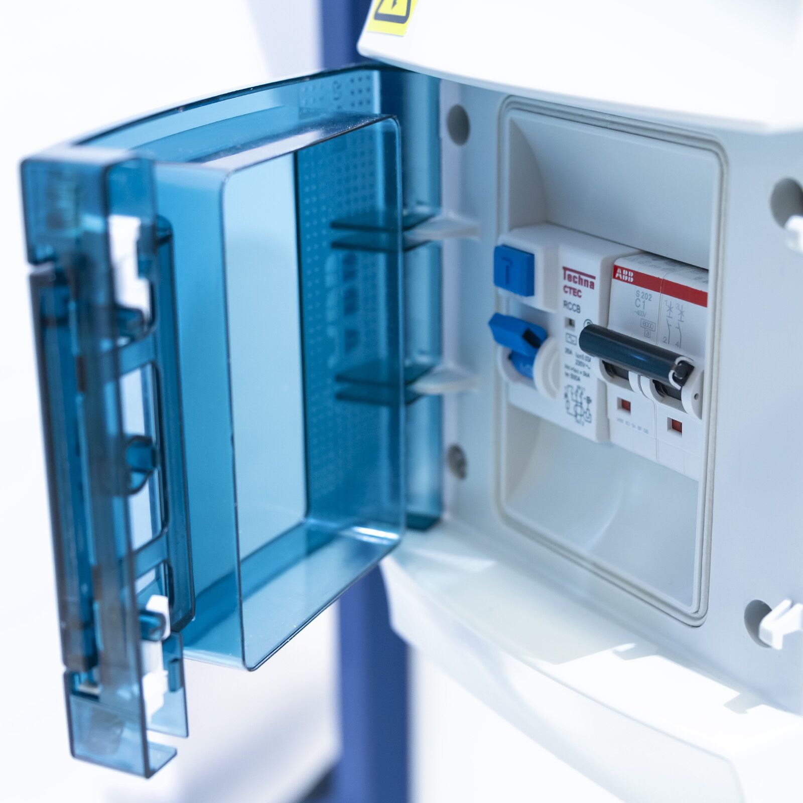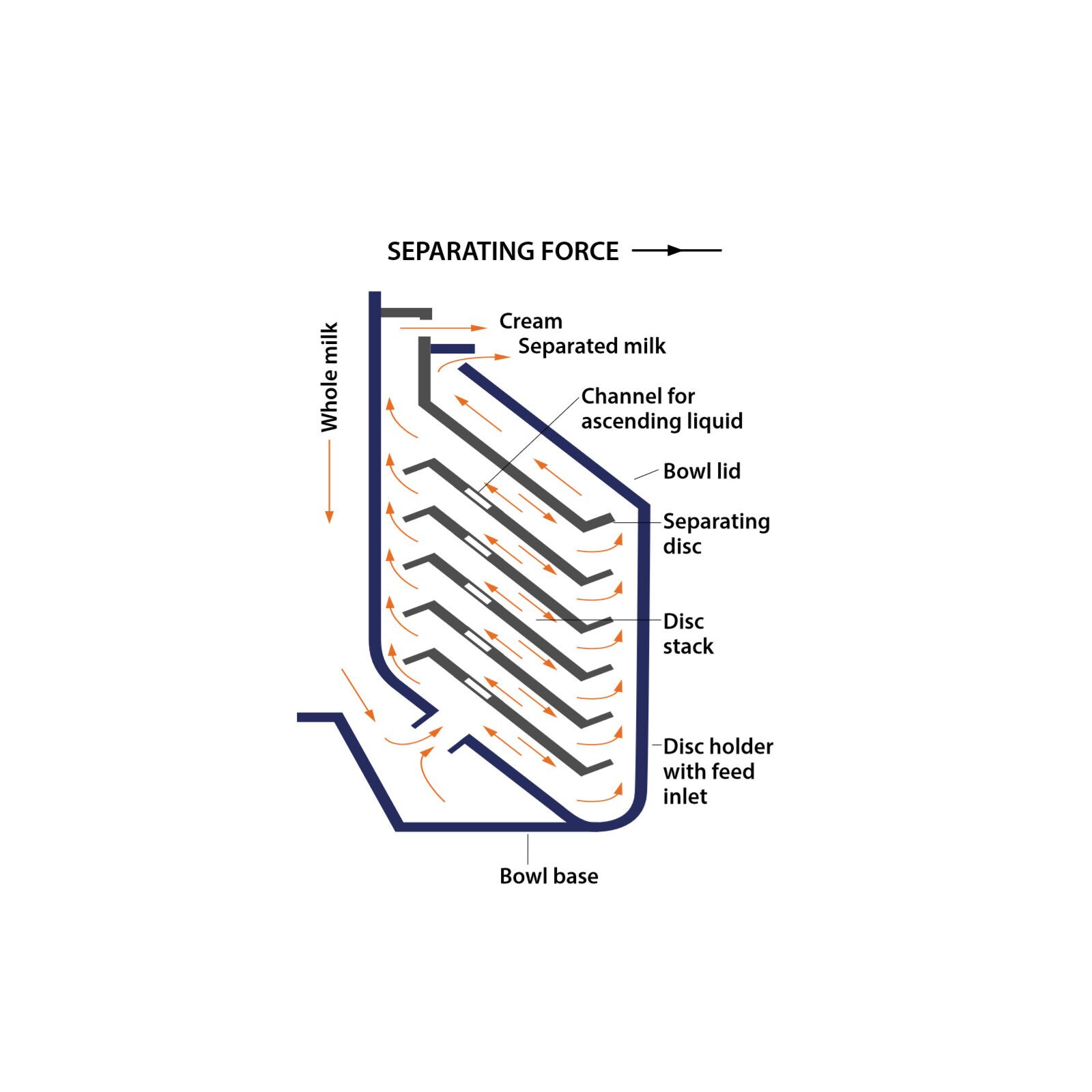 The feed reservoir, positioned over the centrifuge, is made from grey anodised aluminium and contains a polypropylene on/off valve. The separator bowl assembly is made up of stainless steel disks and an anodised aluminium casing with nitrile rubber sealing ring, housed in a polypropylene shroud which incorporates the cream and skimmed milk outlets.