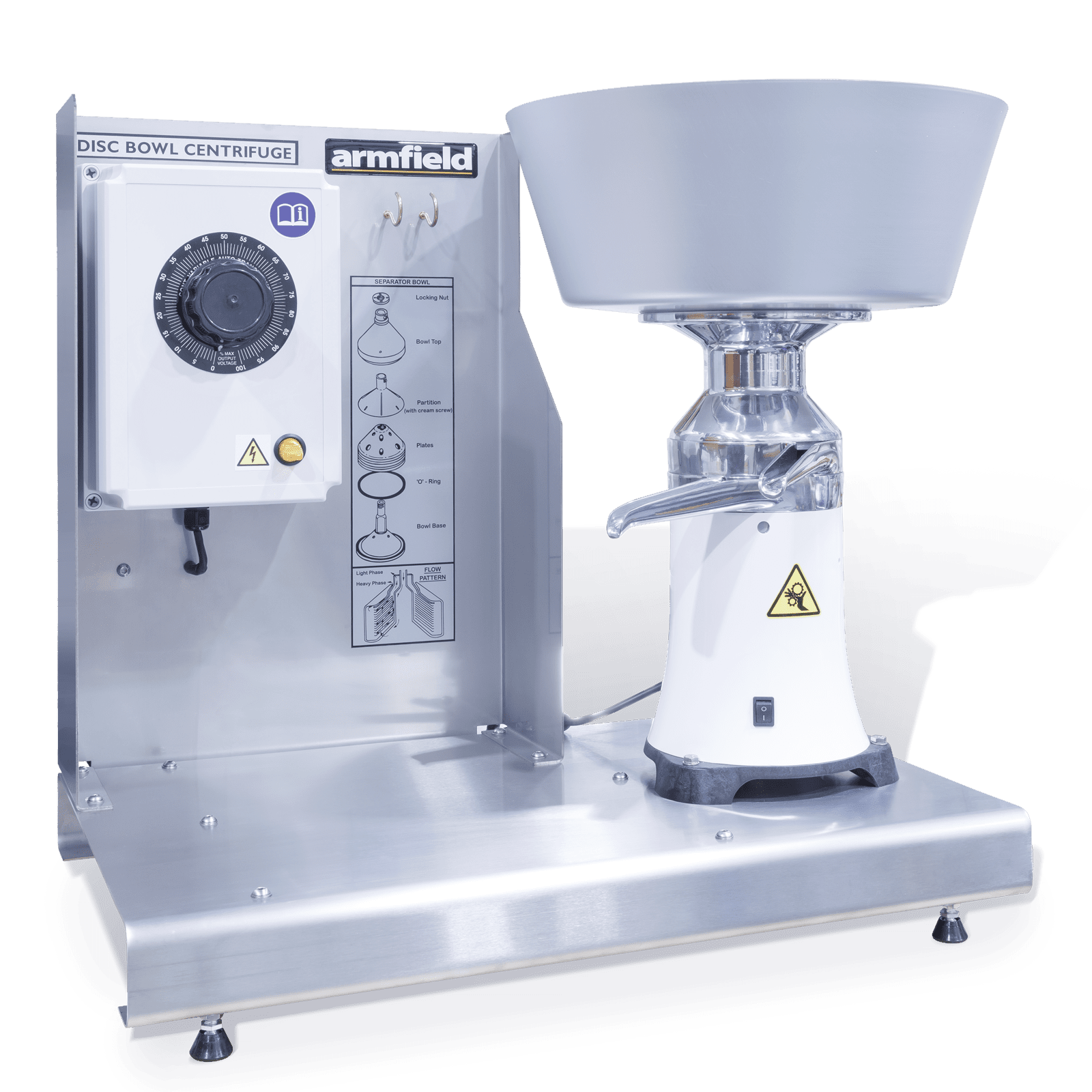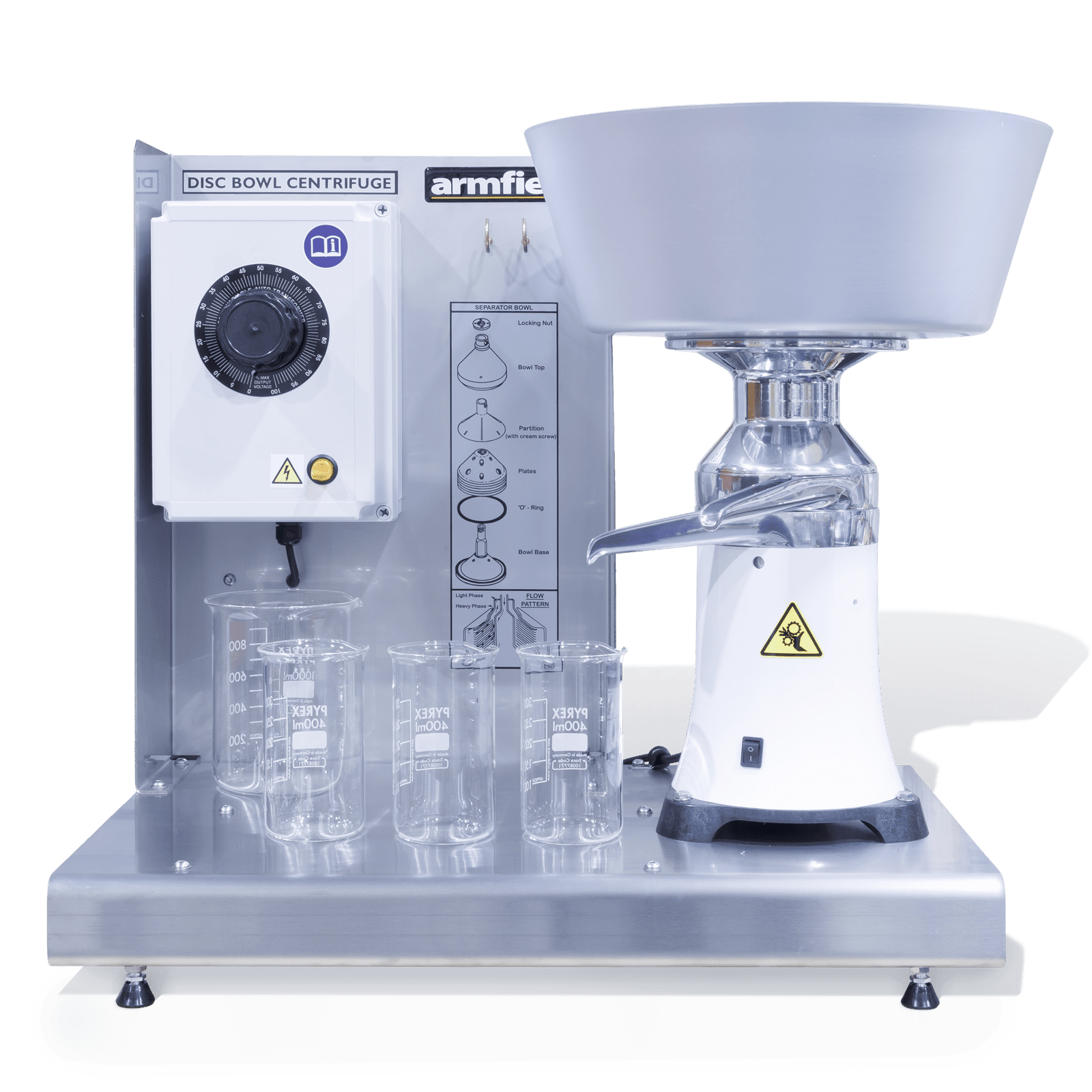 The Armfield Disc Bowl Centrifuge is designed to provide practical training in the technique of separating a heavy phase liquid from a lighter phase liquid with particular emphasis on the separation of cream from milk. Throughput’s of up to 125 litres/hour are possible and 12 motor speeds between 8,500 – 10,000rpm are selectable.