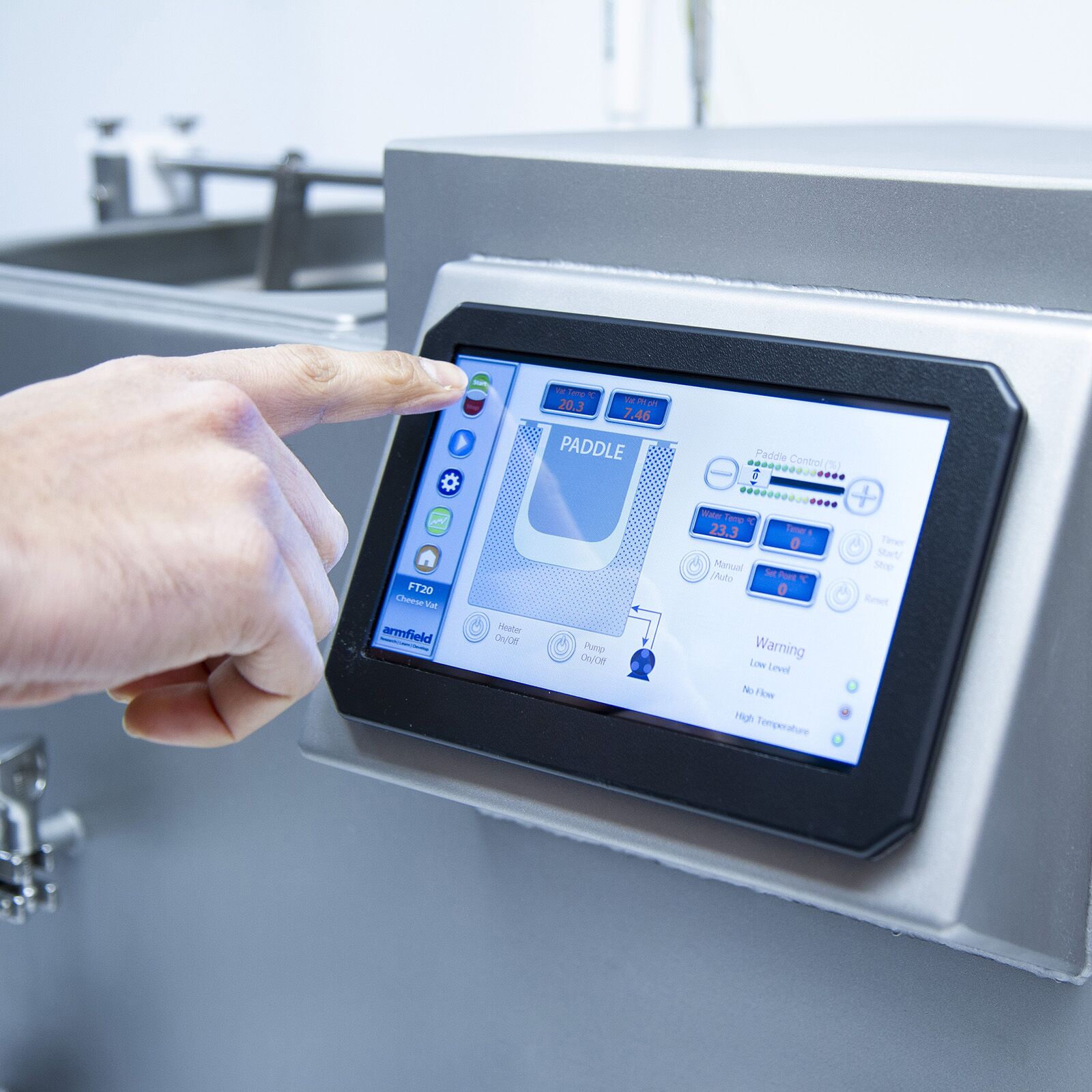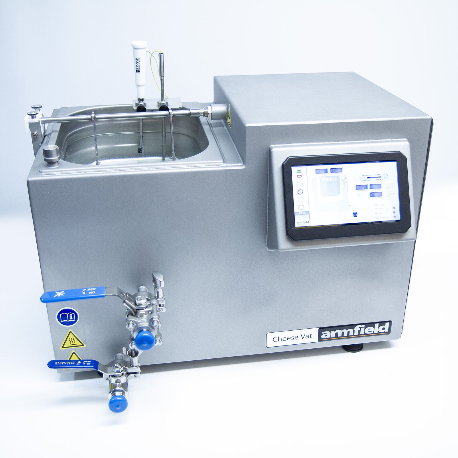 The Armfield Cheese Vat (FT20) is a small-scale version of the industrial processing vessel in which these operations are carried out. The unit was developed from the original design by a prominent dairy foods research institute. The vat, having a batch capacity of either 10 or 20 litres dependent upon model, creates representative batches of soft and hard cheeses for demonstration, research and analysis purposes.