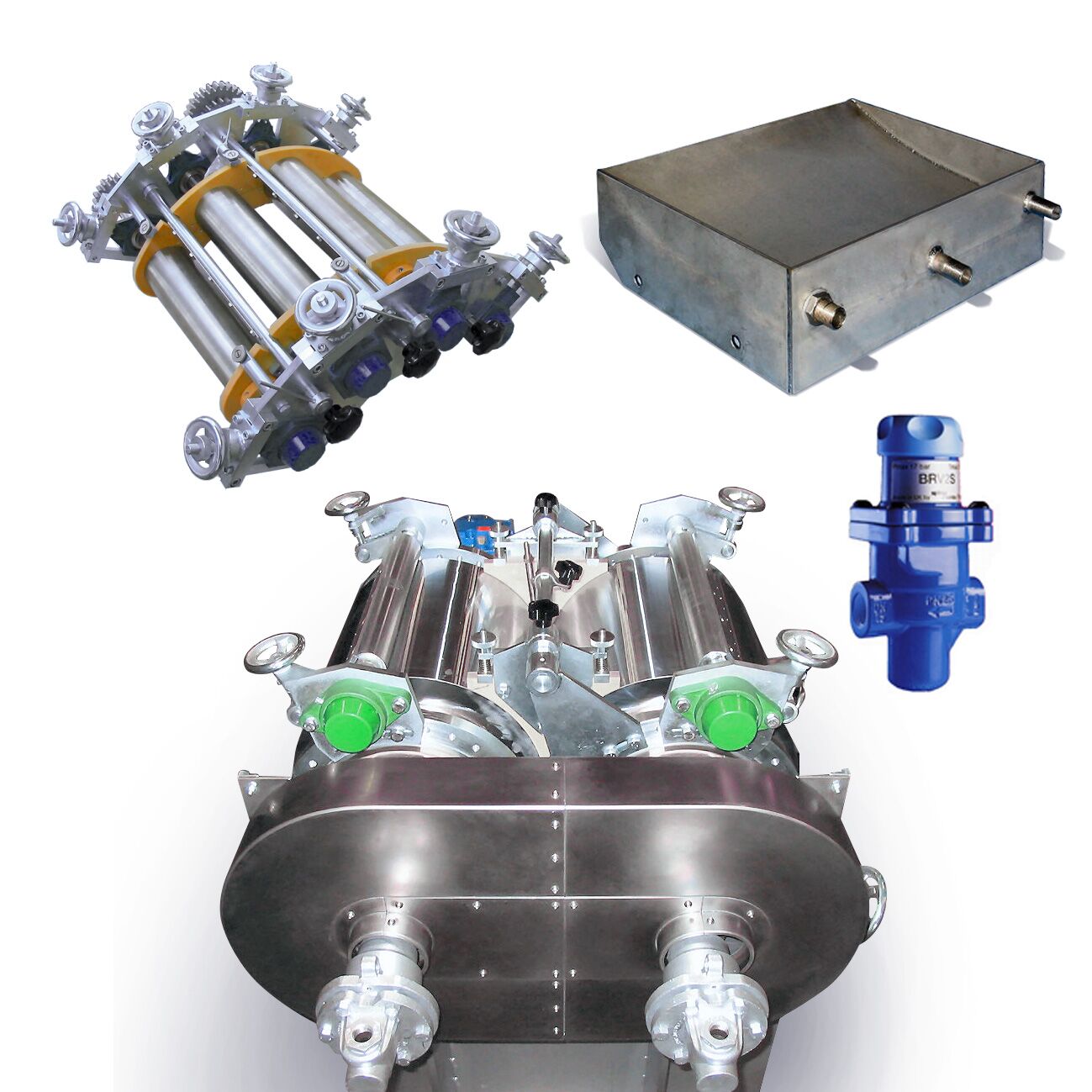 The equipment is supplied fully assembled and ready for connection to site services. The liquid to be dried is fed into the valley created by the two drums, where it is applied to the drums as they rotate together, the dry product is removed by a knife on each drum.
