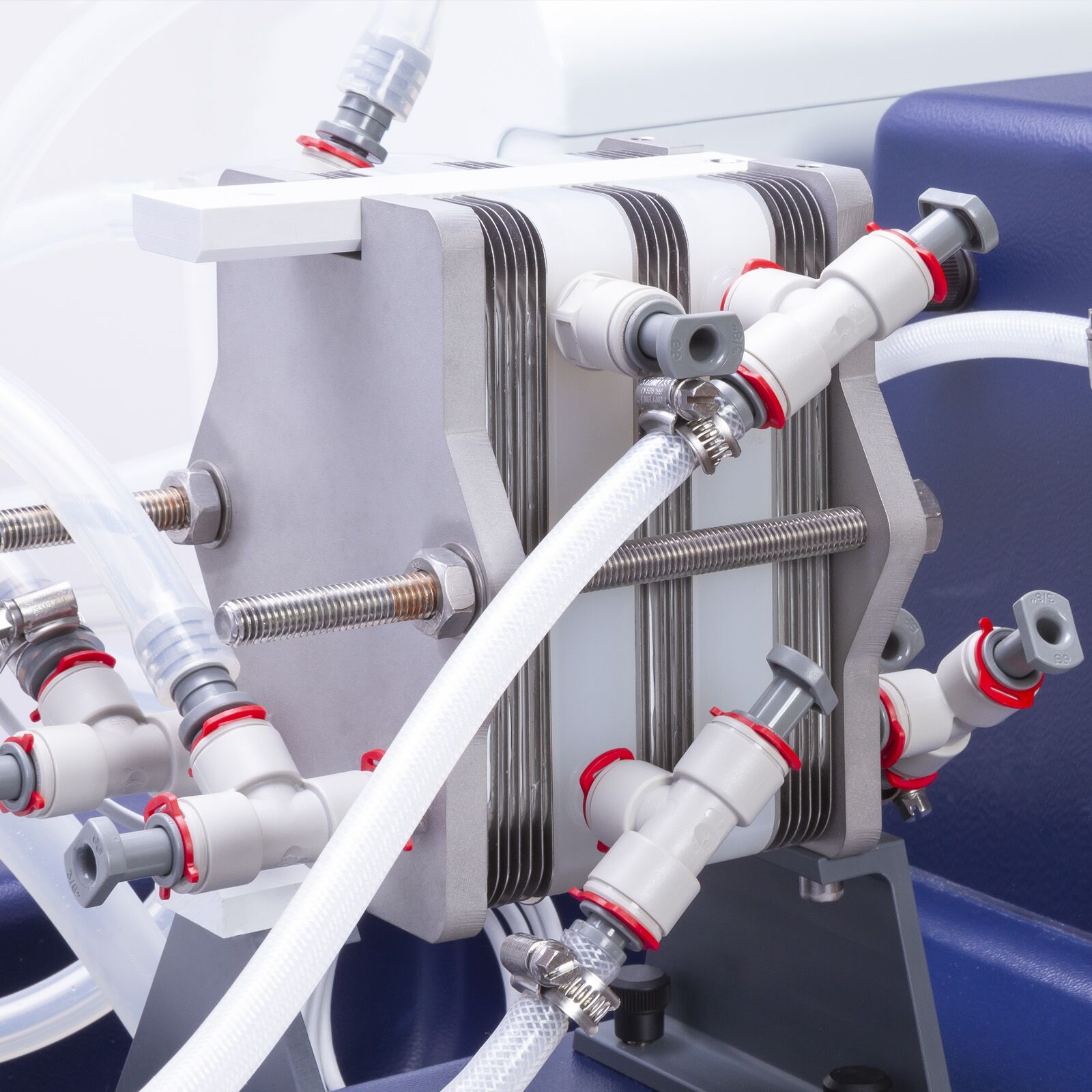 The three stage plate heat exchanger of the FT75 (fig1) achieves these parameters by (1) heating the process liquid with hot water prior to its entry into the holding tube and then by (3) cooling with cold water to storage temperature. An intermediate heat exchanger (2) transfers heat from the treated product to the feed liquid. This provides dual benefits in reducing the energy required to reach the pasteurising temperature and in reducing the cooling required. An optional Armfield CW17 Chilled Water Circulator is available. Full instrumentation and controls are provided to regulate heating water temperature and also feed pump speed which in turn regulates holding time.
