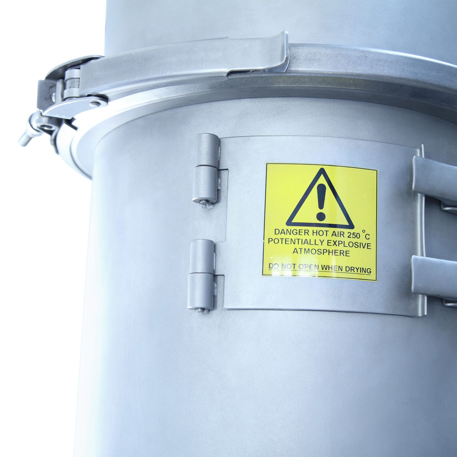 It is atomised by a two-fluid nozzle and enters the drying chamber as a fine droplet dispersion. Hot air is blown into the chamber, on to the droplets causing flash evaporation of the surface moisture. The bound moisture in the particles is evaporated in the time that they fall to the discharge point at the base of the cone (the residence time). In this configuration the particle temperature will never exceed the wet bulb temperature of the exhaust air.