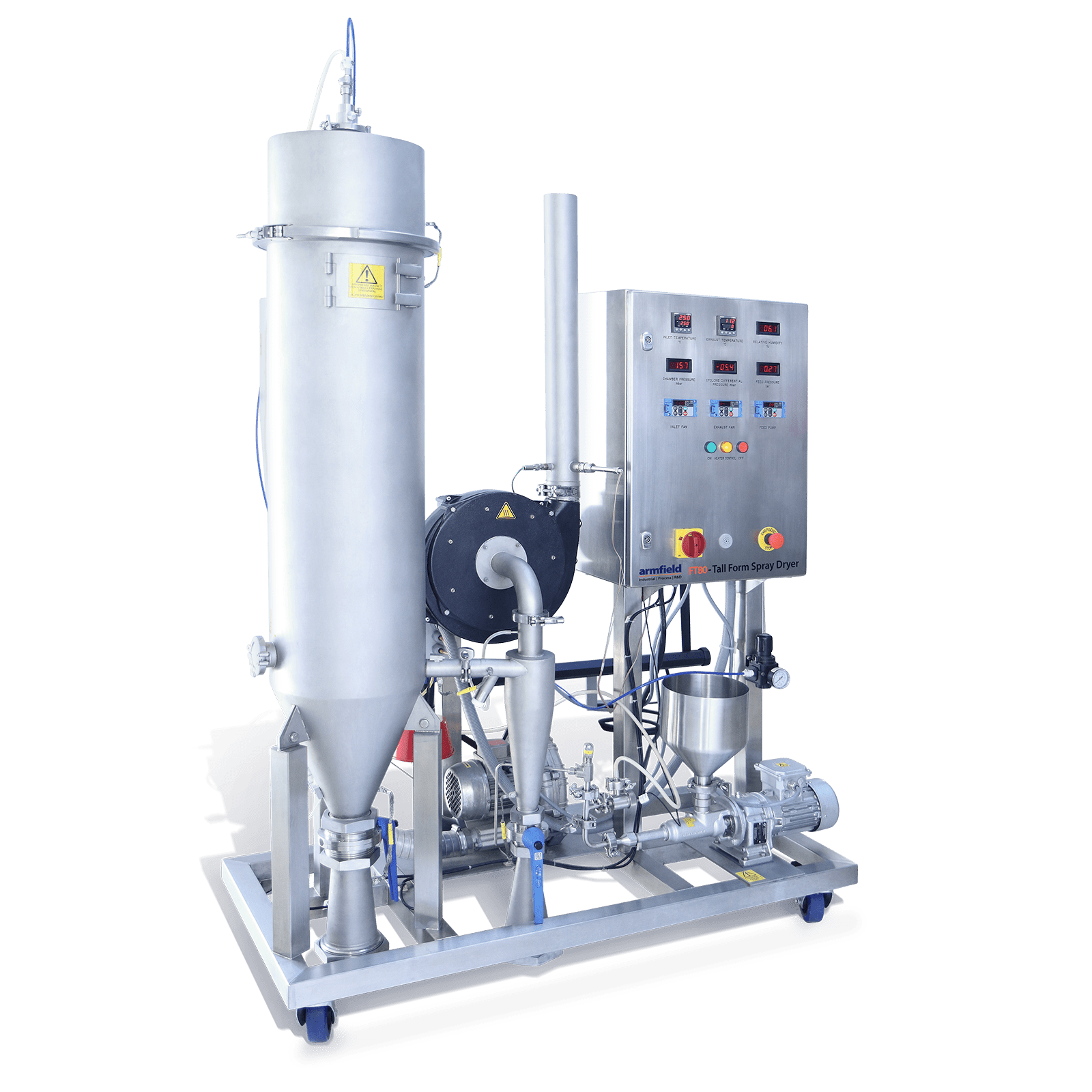 he Armfield Tall Form Spray Dryer has been specifically designed to enable small quantities of product to be processed. The functional properties of the powders produced are comparable to large-scale production dryer capabilities. The FT80 can be quickly and easily configured as a Spray Chiller (FT81) capable of handling products such as bakery shortening mixes containing high melting point fats to be converted from liquid to powder.