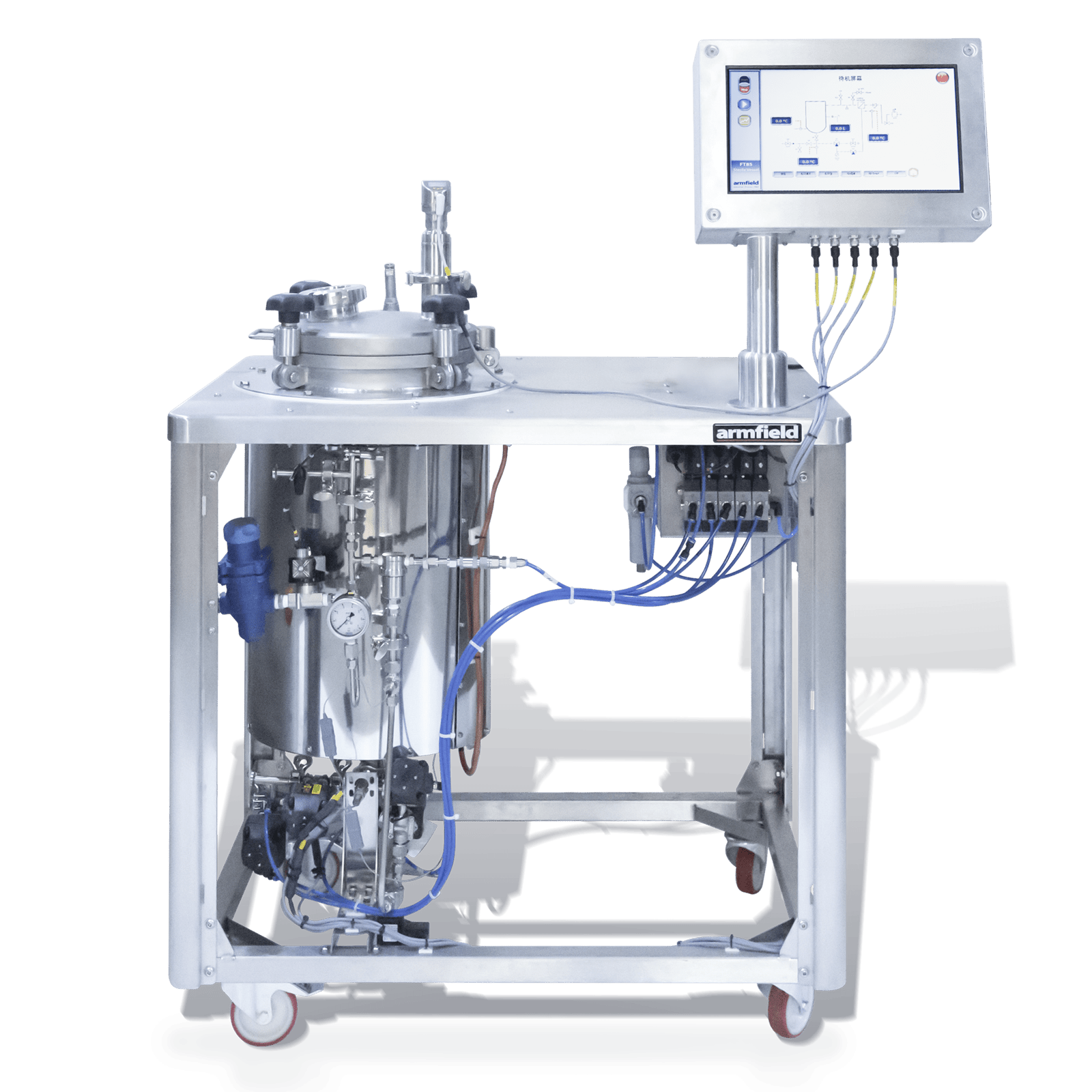 The FT85 is controlled via a touchscreen mounted on the unit with modes for vessel filling, vessel emptying (bottling), sterilisation and cleaning. Vessel volume 30 litres or 200 litres.
