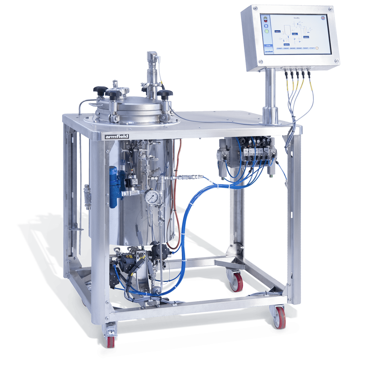 The Armfield FT85 Sterile Vessel can store UHT processed product for sterile filling at a later point. It eliminates product wastage associated with pilot-scale continuous-operation filling systems that lack buffering capacity. The vessel is sited between Armfield’s UHT processing units and the FT83 Sterile Filling System and is available with vessel sizes from 30 litres as standard (other sizes on request). It is designed for operation with Armfield systems, but can be operated with other equipment.