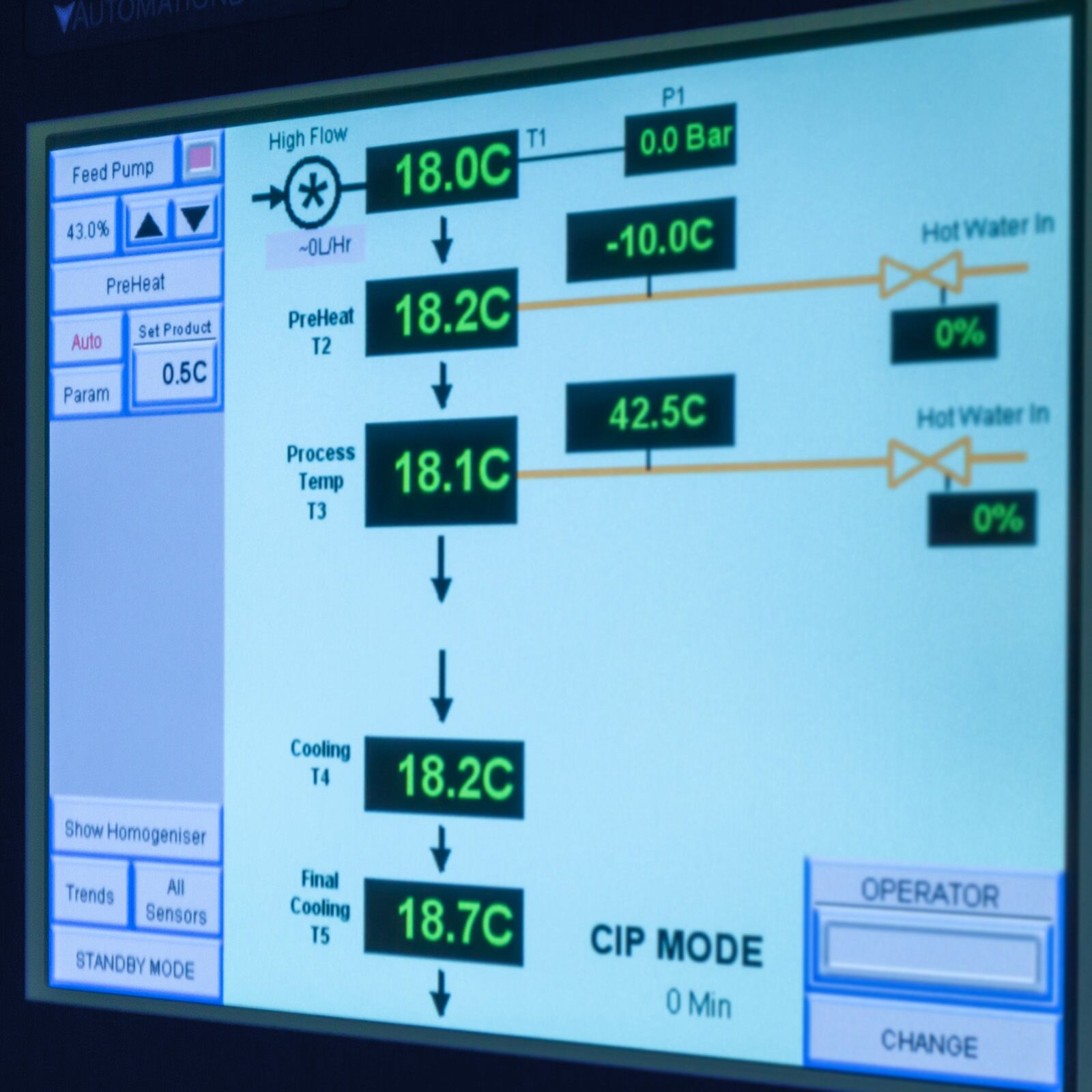 For the main heating, steam is applied to the service side of the heating section using an electro-pneumatic steam control valve. The product temperature is measured at the end of the heat exchanger (or holding tube). This value is used by a Proportional, Integral and Derivative (PID) control algorithm (implemented in the Programmable Logic Controller (PLC)), to control the steam regulating valve, hence ensuring the user defined set point is maintained.