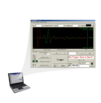 The GDS Bender Elements Software provides an excitation signal to the source element of sine, square, or user defined waveform. The acquired data from the receiver element is displayed on screen, and the software provides a range of helpful functions to enable the user to successfully ‘pick’ the trace and calculate the travel time between elements.