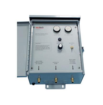The PRS Control Panel can be used with most bladder/ positive air displacement pumps. The dual timers can be adjusted to vary the intake and discharge cycle time. The pneumatic Tankfull Shut-Off Sensor shuts off the pump when the recovery tank is full. The system will not restart until the manual reset is pressed.