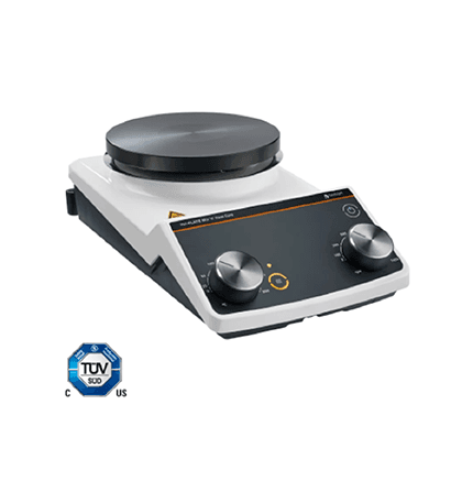 This magnetic stirrer is very easy to use and is equipped with the most important safety features. The large safety distance between the heating plate and the control elements, as well as the optical residual heat indicator at temperatures > 50 °C, protect against burns. A carrying aid on the underside ensures safe transport.