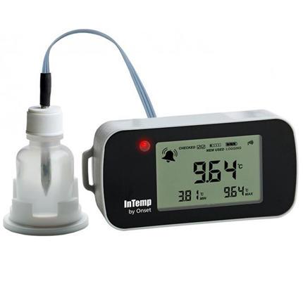 InTemp ® CX402-T215 (with Glycol Bottle) data loggers monitor temperatures in refrigerators, freezers and other temperature-controlled environments to comply with global GDP requirements. The loggers communicate wirelessly via Bluetooth Low Energy to mobile devices. Using the InTemp app, you can easily view data, check logger status, set alarms, and create and share secure PDF reports for streamlined reporting and regulatory compliance. All loggers feature a built-in LCD display to view current and daily min and max temperatures, advanced audible and visual alarm capabilities for notification of temperature excursions, an internal sensor for ambient temperature monitoring, and a single-point NIST Certification of Calibration for both the logger body and probe.