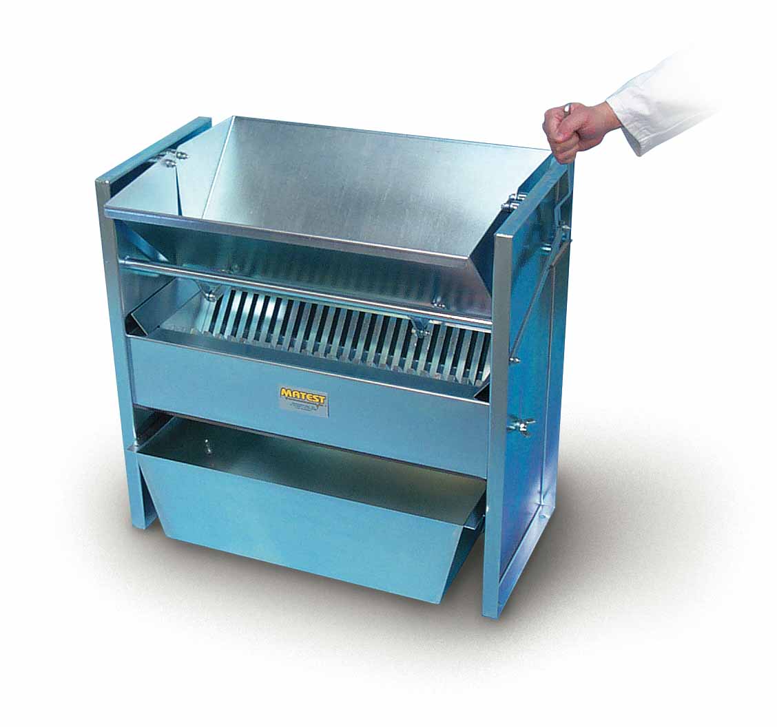Sample splitter designed for the reduction of test samples which are too large in volume to be conveniently handled. It handles any material from sand sizes up to dia. 108 mm. Each chute bar is 12 mm wide so that openings of 12-24-36-48-60-72-84-96-108 mm are possible. Complete with two collecting pans.
