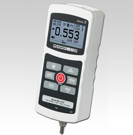 The M5-2-COF coefficient of friction (COF) gauge is an integral part of a COF testing system, typically including a motorized test stand and COF fixture. With a capacity of 2 lbF [10 N], the gauge can be used to measure friction for a wide range of materials, ideal for conformance to ASTM D1894 and other relevant standards. Static and kinetic coefficients are displayed on the backlit LCD, and are calculated from a user-programmable sled weight.