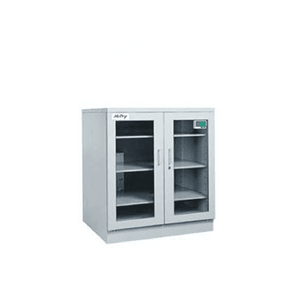 McDry humidity storage cabinet maintains ultra-low humidity levels under the recommended indefinite safe floor life guideline of dry storage at 5% RH or less.