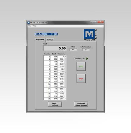 MESUR™ Lite is a basic data collection program included with all new Mark-10 gauges with outputs. MESUR™ Lite tabulates continuous or single point data from a gauge. Data saved in the gauge’s memory can also be downloaded in bulk. MESUR™ Lite is included with all new force gauge series.
